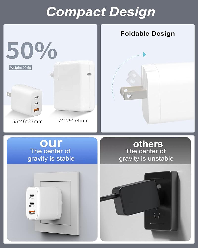 • قابس قابل للطي: مصمم لسهولة الحمل والراحة، ويتميز القابس بتصميم قابل للطي يوفر المساحة ويحمي الشوكات عند عدم الاستخدام. يمكن وضعه بسهولة في الحقائب أو الجيوب أو حقائب السفر، مما يجعل الشاحن بقدرة 65 واط مثاليًا للشحن أثناء التنقل.