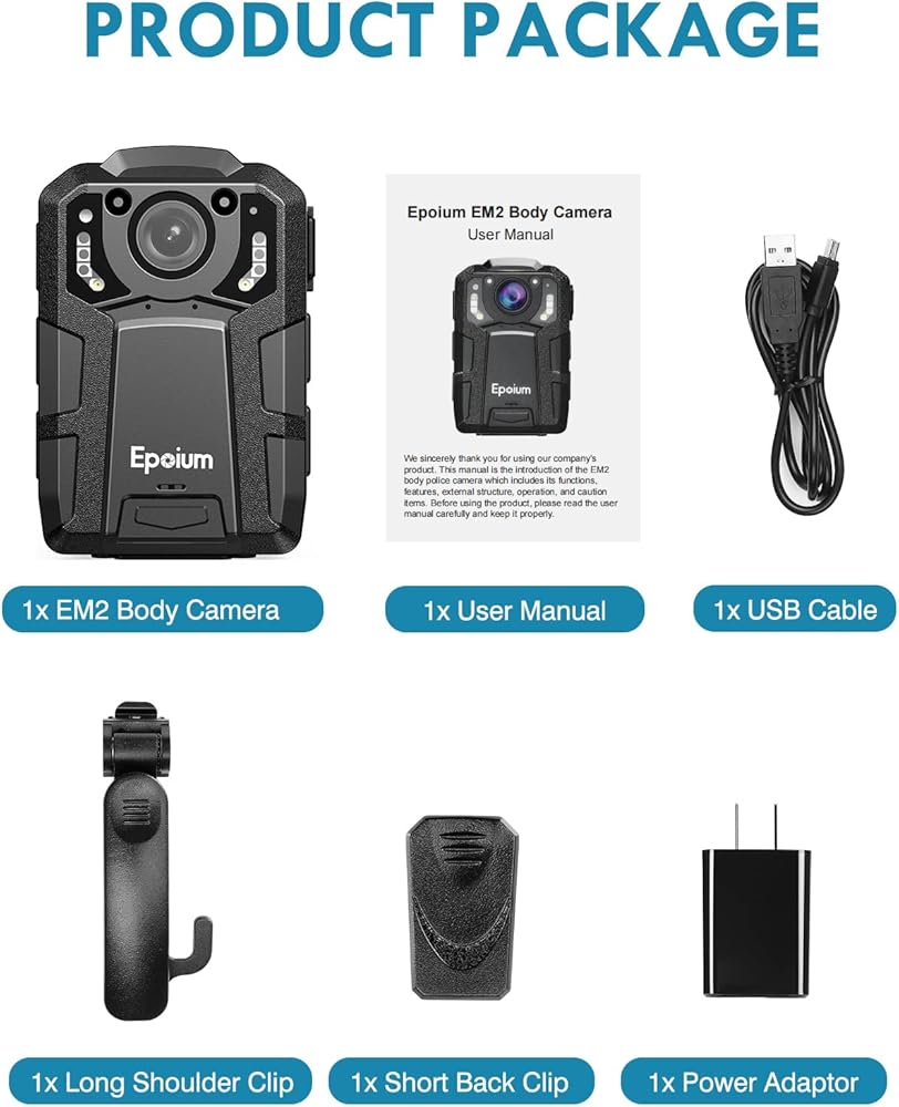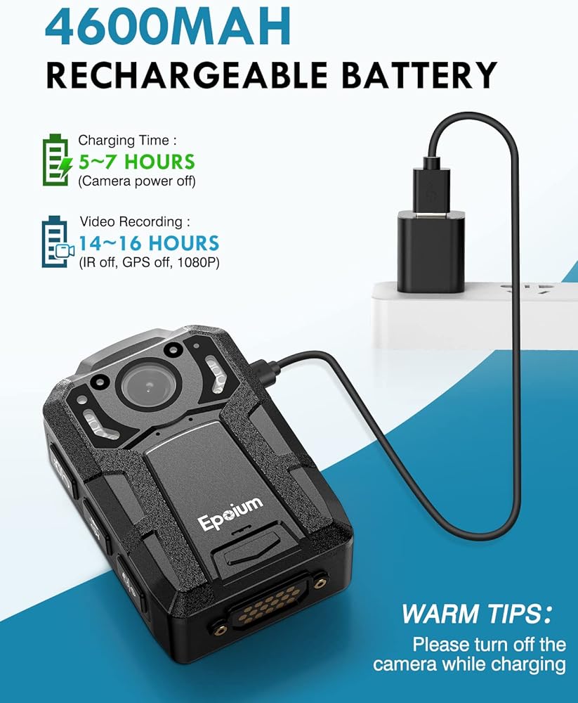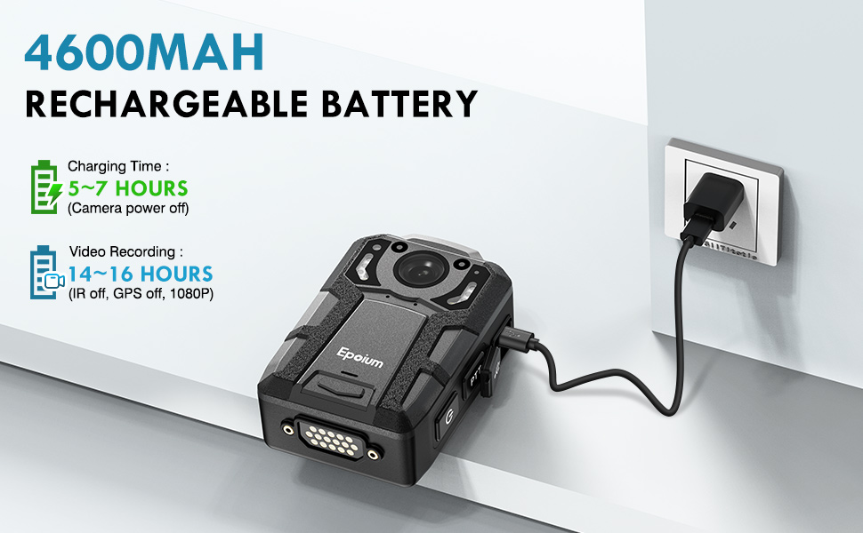 عمر بطارية طويل: تأتي كاميرا Epoium EM2 التي يتم ارتداؤها على الجسم مع بطارية قابلة لإعادة الشحن بقدرة 4600 مللي أمبير في الساعة، مما يسمح بالتقاط ما يصل إلى 14-16 ساعة من اللقطات تحت 1080 بكسل، وإيقاف تشغيل الأشعة تحت الحمراء، ووضع إيقاف تشغيل GPS بعد الشحن الكامل. يستغرق الشحن بالكامل من 5 إلى 7 ساعات (الكاميرا في حالة إيقاف التشغيل).