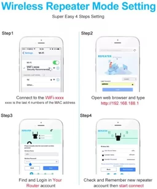 3. اتصل بـ "wifi-XXX" ثم انتقل مباشرة إلى صفحة المتصفح لتعيين معلومات WIFI الخاصة بالمكرر، وكلمة مرور تسجيل الدخول: admin، ثم قم بتوصيل اسم جهاز توجيه wifi الخاص بك وأدخل كلمة المرور (ملاحظة: كلمة المرور غير قابلة للاستخدام "") ، قم بتعيين موسع SSID وكلمة المرور، لاحظ أن كلمة مرور مجموعة المكرر بالداخل يجب أن تكون نفس كلمة مرور WIFI الخاصة بجهاز التوجيه!!!انقر: ابدأ الاتصال، انتظر 30-60 ثانية، اضبط بنجاح، ضوء موسع قيد التشغيل