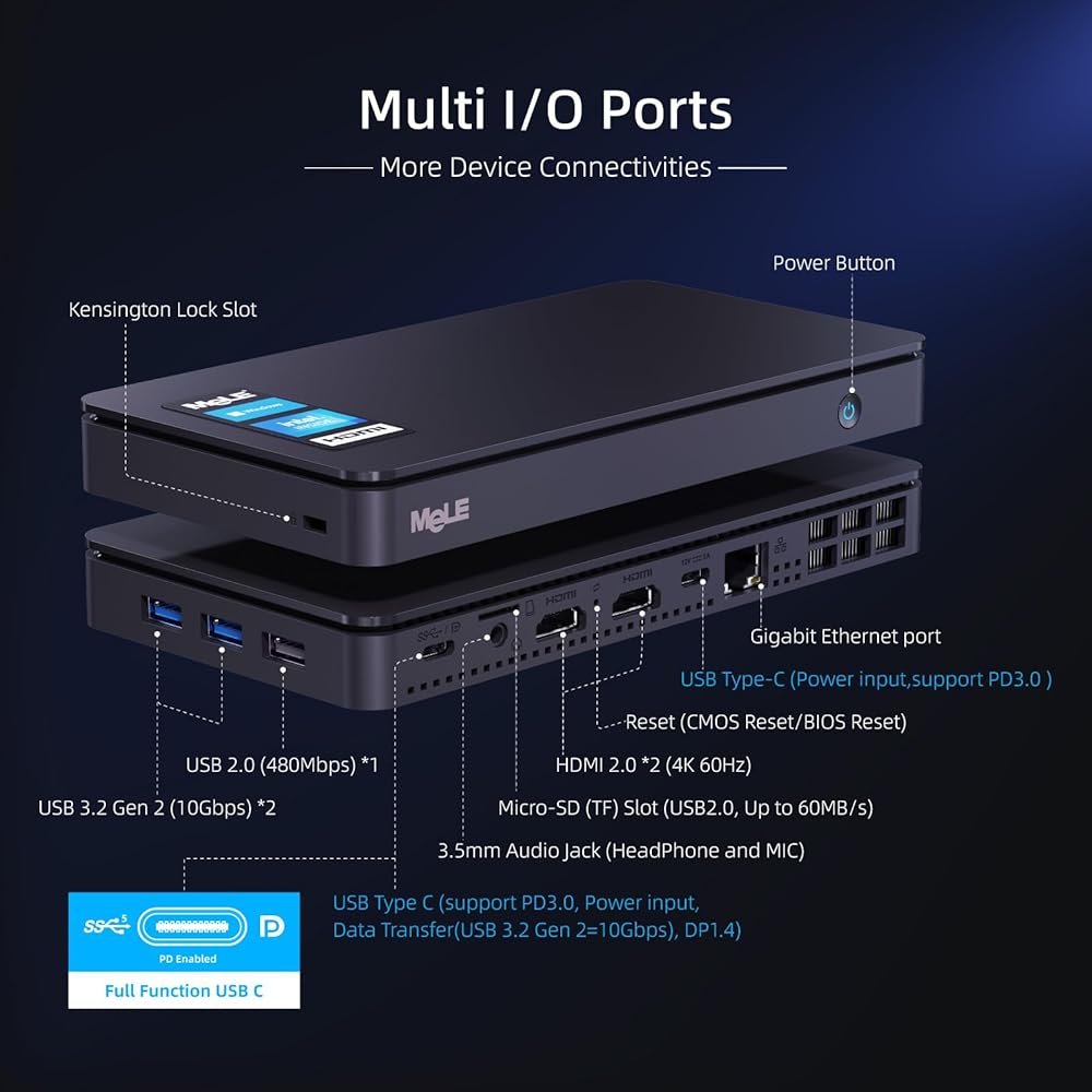 【قوي وفعال】تم تجهيز هذا الكمبيوتر الصغير الحجم بمعالج Alder Lake N95 رباعي النواة حتى 3.4 جيجا هرتز مع نظام التشغيل Windows 11 Pro 64 بت الأصلي المثبت مسبقًا، ويمكنه تشغيل Linux وUbuntu وDebian في وقت واحد مثل الكمبيوتر التقليدي. وهو يدعم Wake on LAN / PXE Boot / Auto Power on / RTC Wake، وهو مثالي لمجموعة واسعة من الاستخدامات مثل المهام المكتبية الأساسية، والاستخدام الشخصي، وبث الوسائط المتعددة، والمسرح المنزلي، والتعليم عبر الإنترنت، والمؤتمرات، واللافتات الرقمية، وإنترنت الأشياء الصناعية.