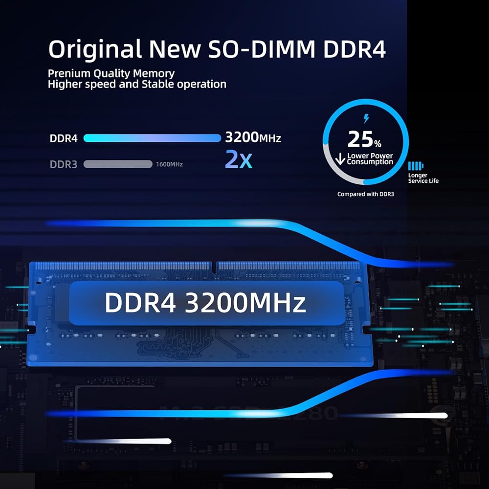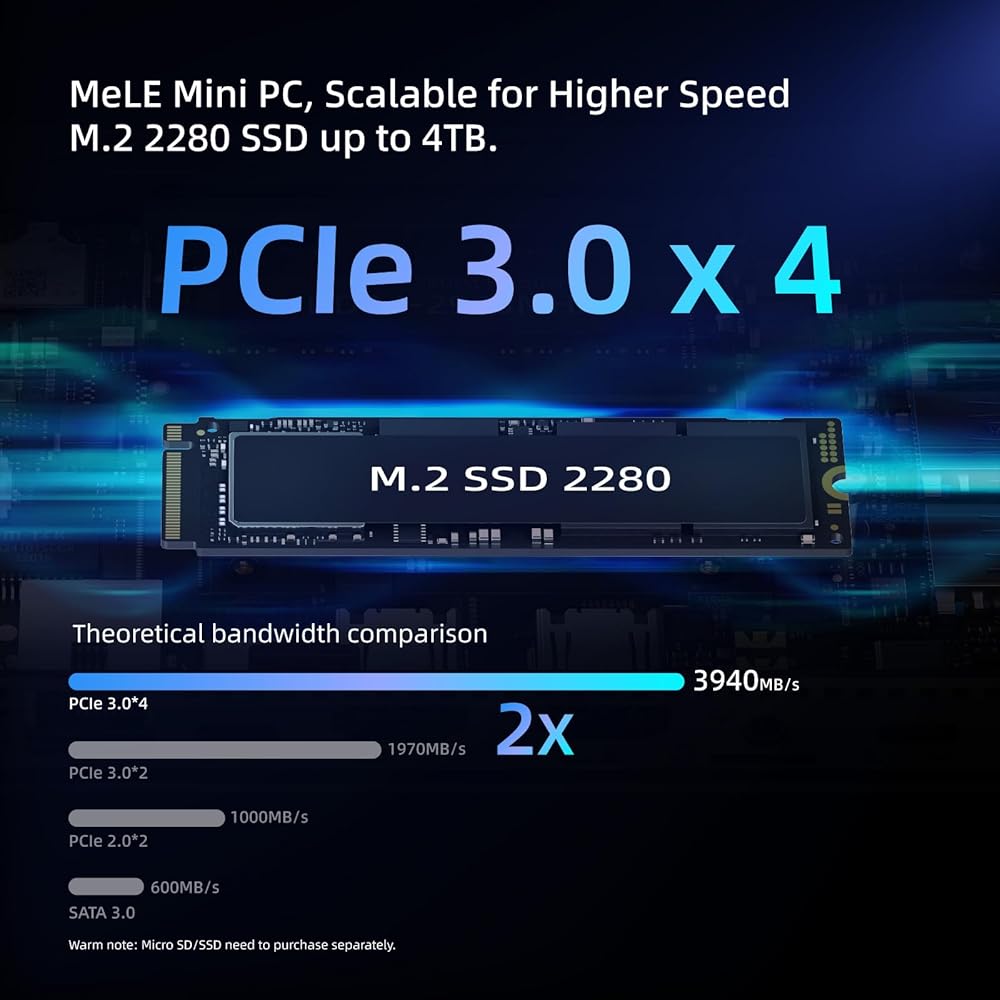 【سعة أكبر قابلة للتوسيع】الكمبيوتر الصغير مدمج بذاكرة الوصول العشوائي SO-DIMM DDR4 بسعة 32 جيجابايت، و512 جيجابايت (256 جيجابايت على اللوحة eMMC + 256 جيجابايت SSD)، مع فتحة بطاقة Micro SD يمكن إضافتها بشكل منفصل لتوسيع مساحة التخزين حتى 2 تيرابايت وقابلة للتطوير. لسرعة أعلى (سرعة البيانات النظرية 3940 ميجابايت) M.2 2280 SATA SSD & NVMe SSD حتى 4 تيرابايت لـ PCIe3.0 x4.