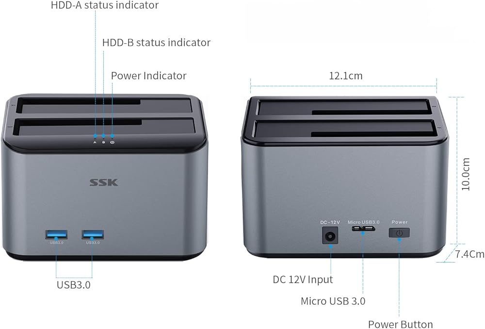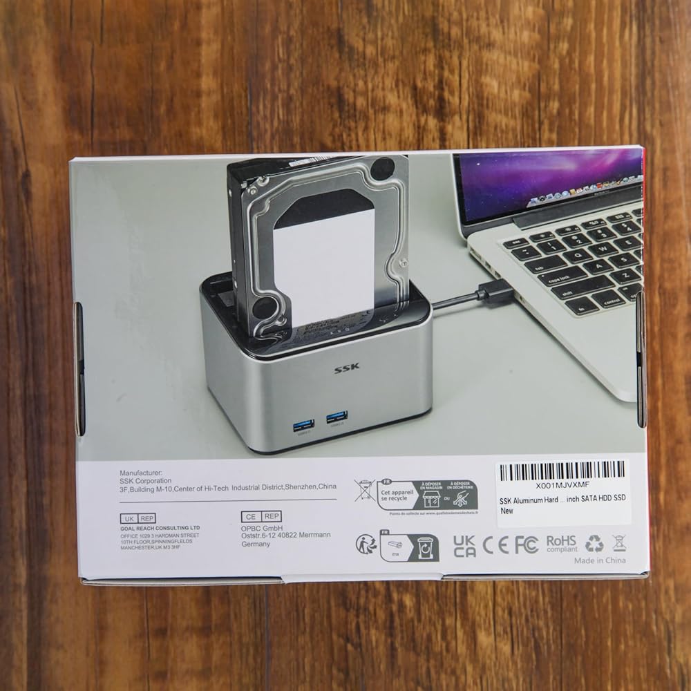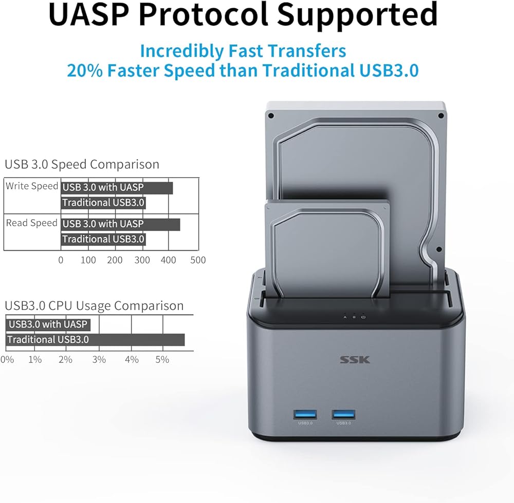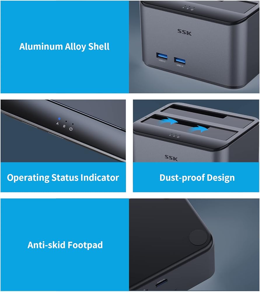 SSK يمكن أن يدعم غلاف القرص الصلب 2 × 16 تيرابايت في وقت واحد لـ ساتا I/II/III HDD/SSD مقاس 2.5/3.5 انش، والذي يمكن استخدامه لاستنساخ القرص الصلب الموجود دون الاتصال بجهاز كمبيوتر، مما يسهل تكرار البيانات من قرص صلب إلى آخر.