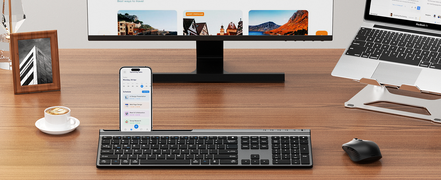 【Full-Size & Ultra-Slim Design】-- Full-size keyboard with numeric keypad for fast typing and calculating, rich multimedia button layouts, also help you greatly improve your workflow and efficiency! Superior durable ABS+PC material, ultra-thin matte gray keyboard, lightweight but stable. Refined and stylish appearance, subtle keystrokes feedback and standard layout make it the perfect companion for your office!