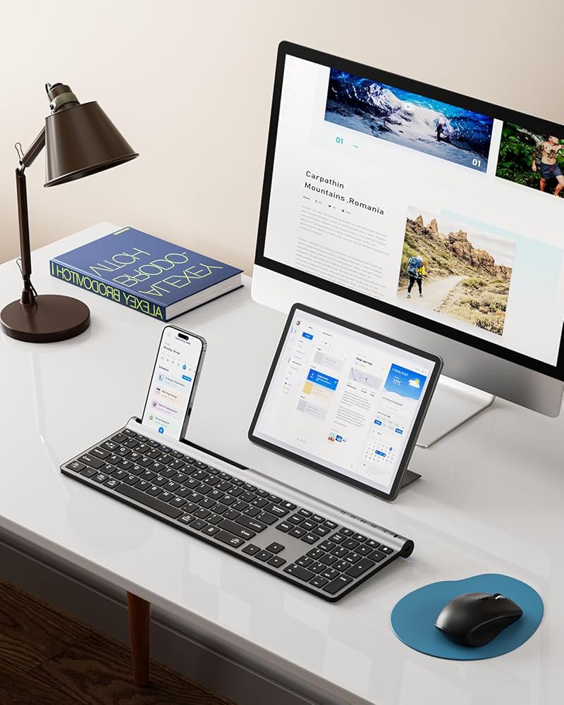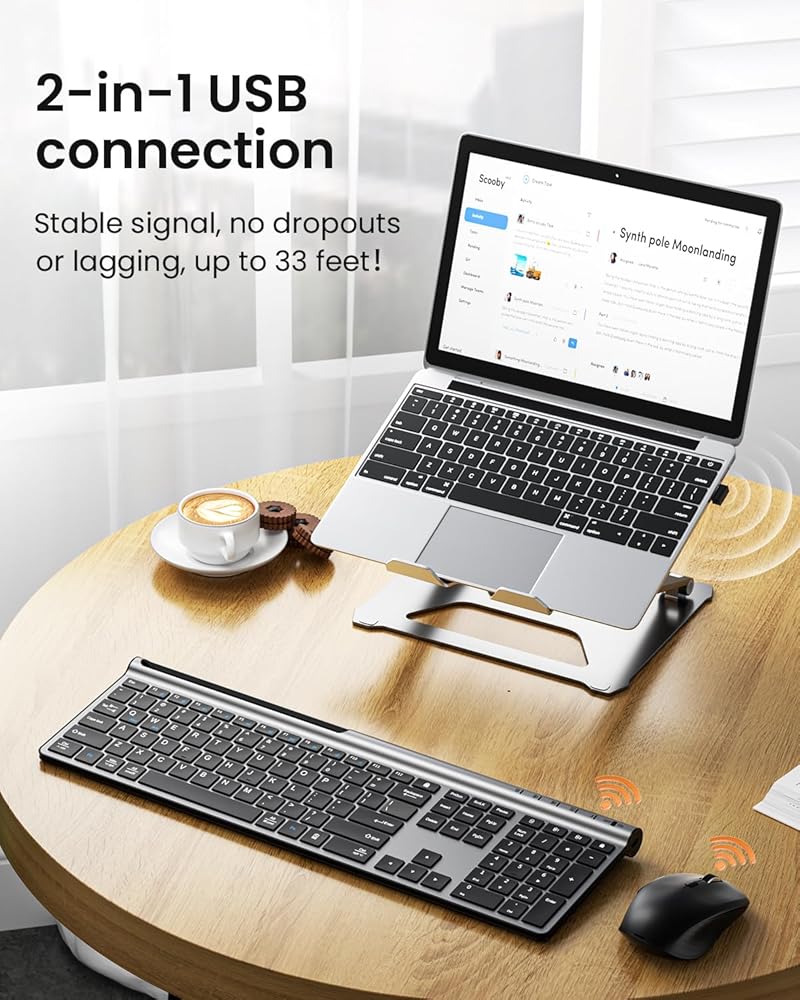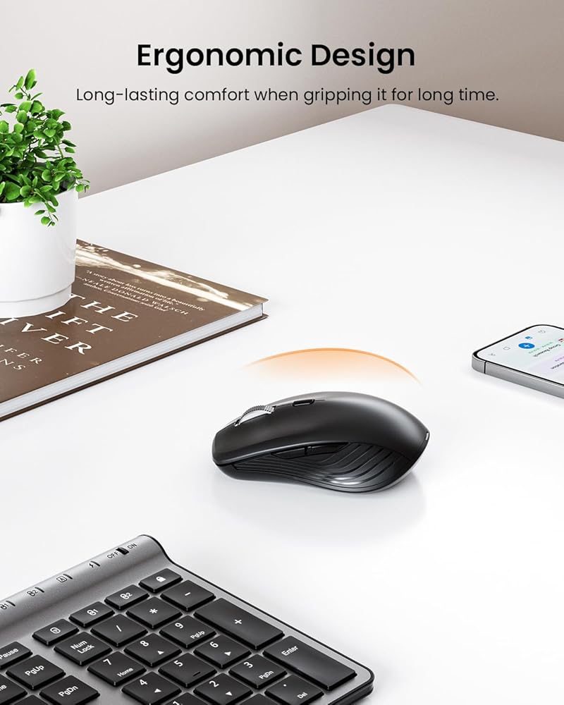 【Dual Bluetooth 5.0 + 2.4G】-- Artciety multi-device wireless keyboard and mouse support up to 3 devices simultaneously (2.4G wireless + BT5.0 + BT5.0). One-key seamless switch device without delay and stuck. Plug and play 2.4G receiver (stored on the bottom of the keyboard) without download plug-ins or drivers. The ergonomically designed angle reduces pressure on the wrist for a more comfortable use!