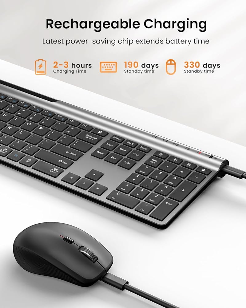 【Type-C & Energy Saving】-- Upgrade latest chip, auto sleep function and Tpye-C fast charging, make mouse and keyboard last much longer. Built-in rechargeable 280mAh (keyboard)/300mAh (mouse) battery. Only 2-3H of charging, it can work continuously for 90H (keyboard)/60H (mouse), or standby for 190 days (keyboard)/330 days (mouse) . It will auto enter sleep mode to save energy after 30min of inactivity. Artciety strives for perfection in every detail, reducing your trouble for frequent charging!