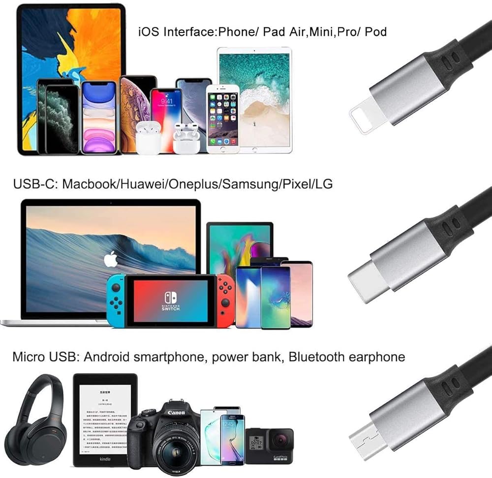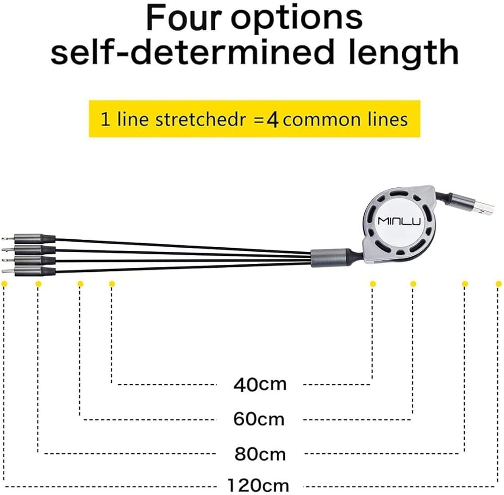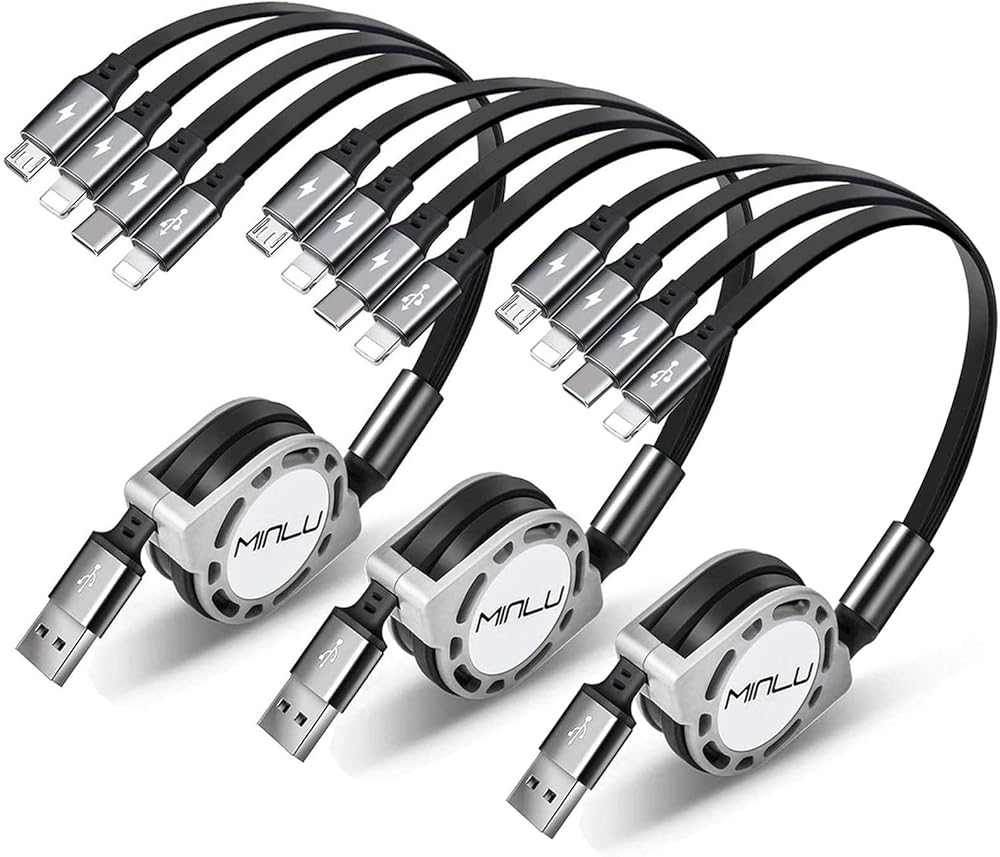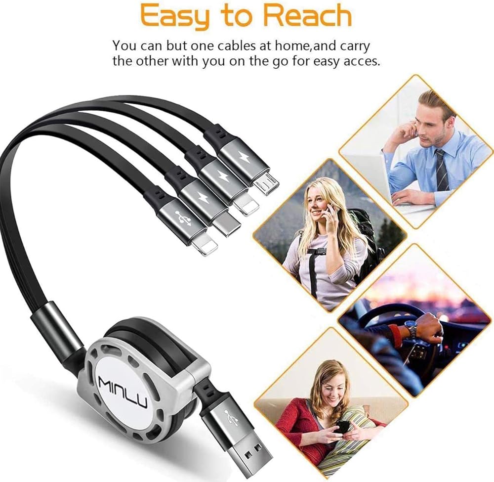 كابل شحن USB متعدد MINLU 4A 4 في 1 سلك شاحن USB سريع قابل للسحب لمنافذ IP/Type C/Micro USB المزدوجة المتوافقة مع الهاتف/Huawei/Samsung Galaxy/Sony/LG/الأجهزة اللوحية (3 عبوات/4 أقدام)