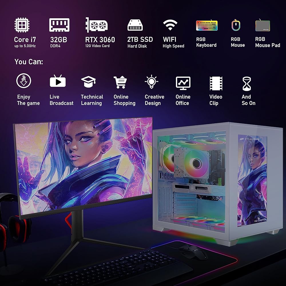 كمبيوتر سطح المكتب للألعاب STGAubron، Intel Core i7-11700KF حتى 5.0G، 32G DDR4، 2T SSD، GeForce RTX 3060 12G GDDR6،600M WiFi، BT 5.0، RGB Fan x 9، لوحة مفاتيح وماوس RGB، لوحة ماوس RGB، W11H64، Windows 11 Home