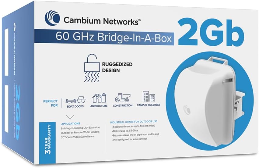 سد الفجوة: يعمل الجسر 60 جيجا هرتز في صندوق 1 جيجا بايت على توسيع الشبكات دون عناء ولاسلكيًا عن طريق توصيل النقطة A إلى النقطة B ببساطة وسهولة. وهو مثالي للاستخدام في المؤسسات والمستهلكين، ويتميز 1 جيجا بايت بنطاق يصل إلى 500 قدم ويأتي مع اثنين من الشبكات اللاسلكية وحدات الراديو وإمدادات الطاقة عبر إيثرنت (PoE) التي يمكن استخدامها لتوسيع شبكتك من أي مكان يوجد به منفذ إيثرنت إلى أي مكان تحتاج إليه. يتضمن سلك الولايات المتحدة/كندا فقط.
