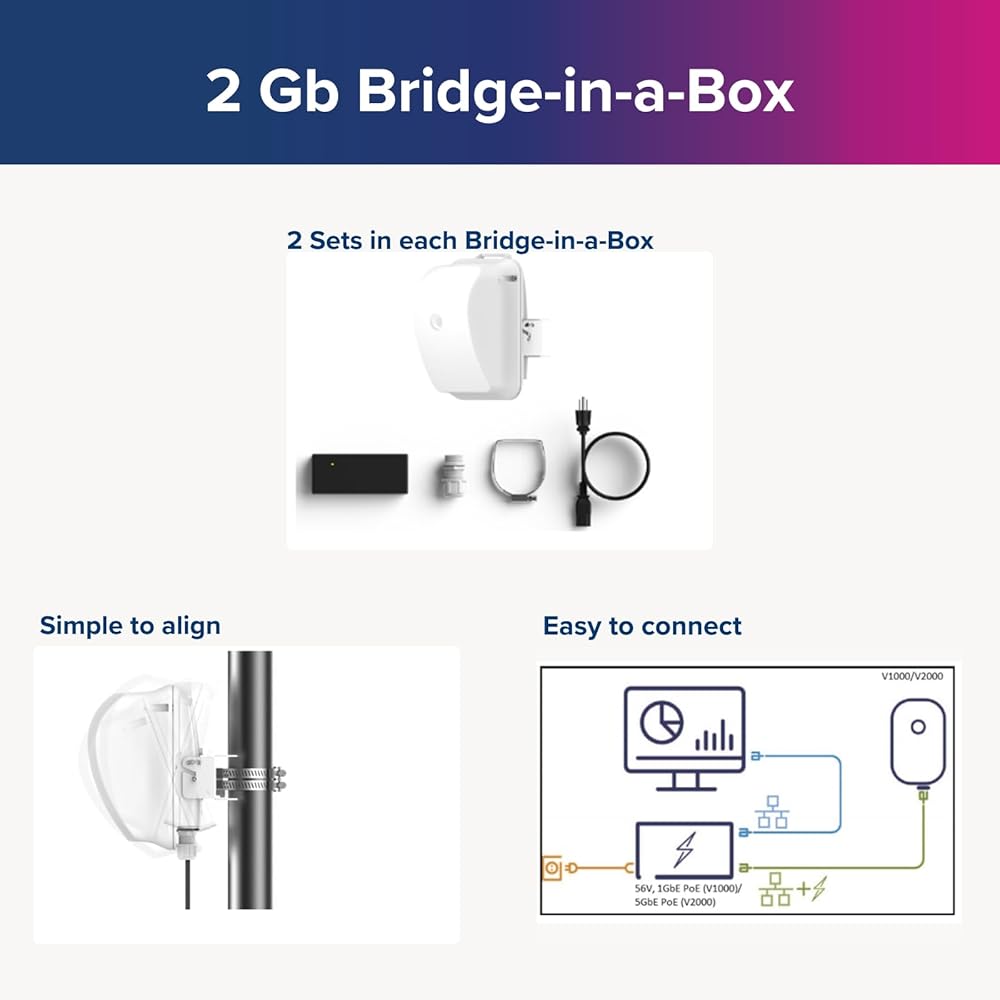جاهز للانطلاق: تم إقرانه مسبقًا وتهيئته مسبقًا، كل Bridge-in-a-Box سهل النشر للغاية، لأنه يأتي مع وحدتي راديو لاسلكيتين وإمدادات الطاقة عبر إيثرنت (PoE) التي يمكن استخدامها لتوسيع شبكتك من أي مكان يتوفر لديك فيه منفذ Ethernet إلى أي مكان تريده.