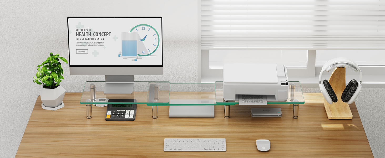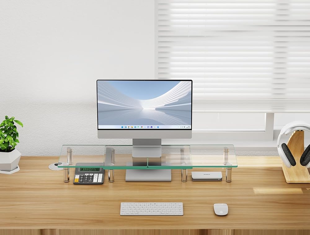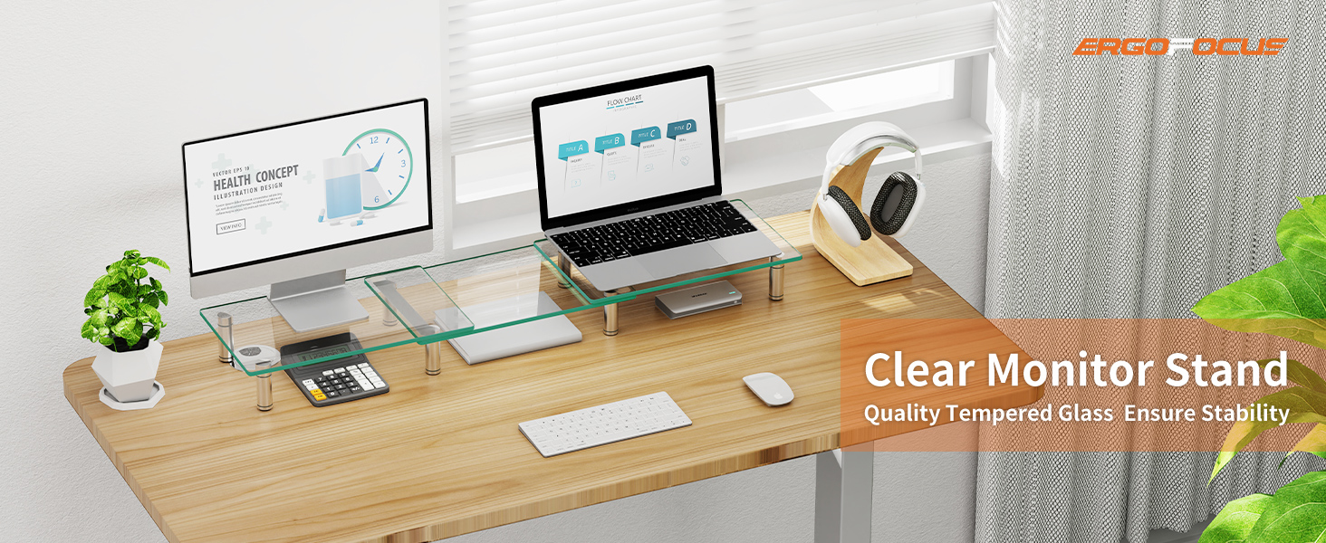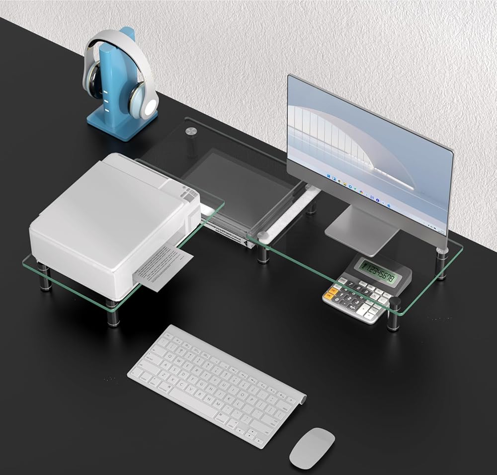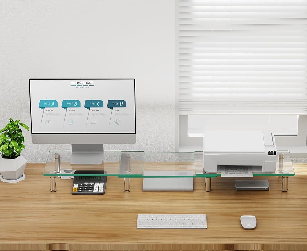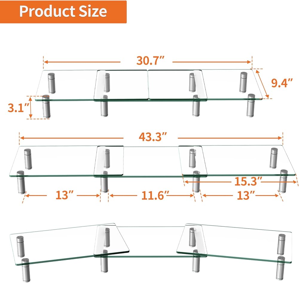 Customize your workspace: with flexible side glass panels, the transparent glass monitor stand riser allows you to adjust the angle and position of your monitors for optimal viewing.