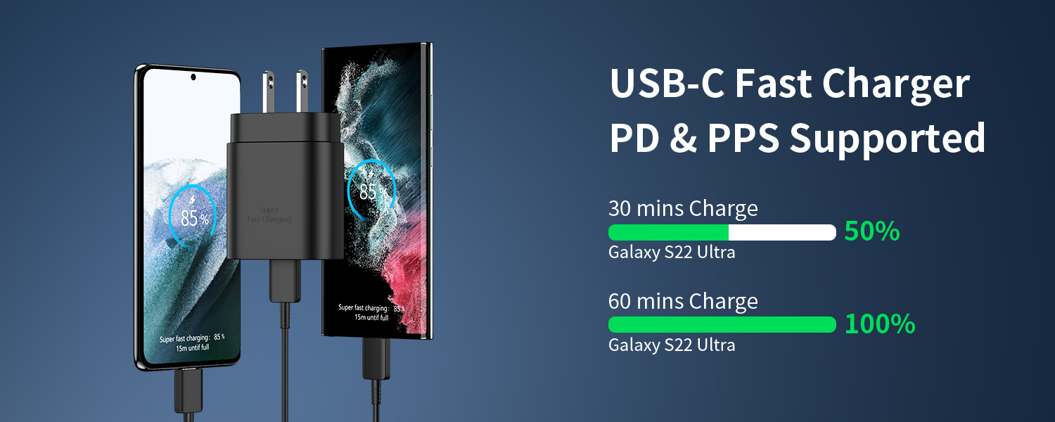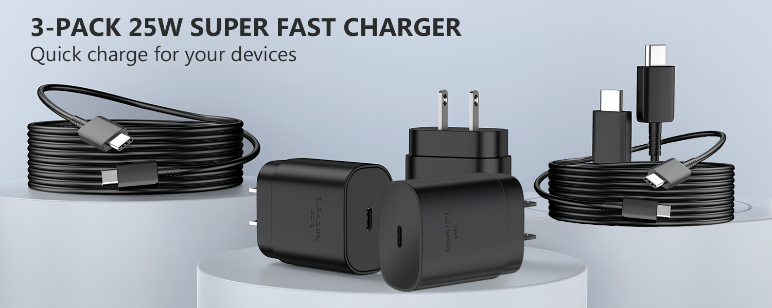 【3 عبوات شاحن سامسونج فائق السرعة مع كابل】مجموعة كابل شحن سريع لشاحن من النوع C بقدرة 25 وات تدعم PD 3.0، QC 4.0/3.0، تقنية الشحن السريع PPS، توفر شحنًا سريعًا للغاية مع أقصى قدر من طاقة الإخراج 25 وات، شحن سريع Galaxy S23 /S22/S21 من 0% إلى 60% في 30 دقيقة فقط، والشحن الكامل في 50 دقيقة.