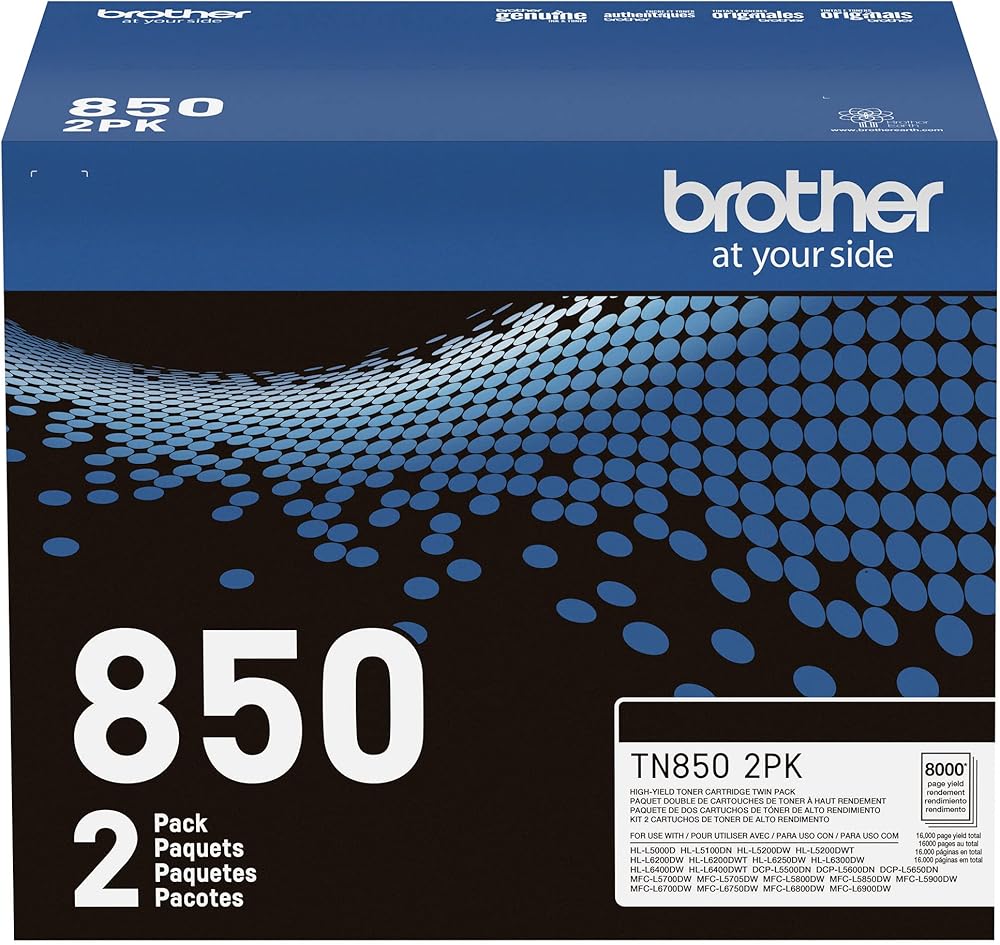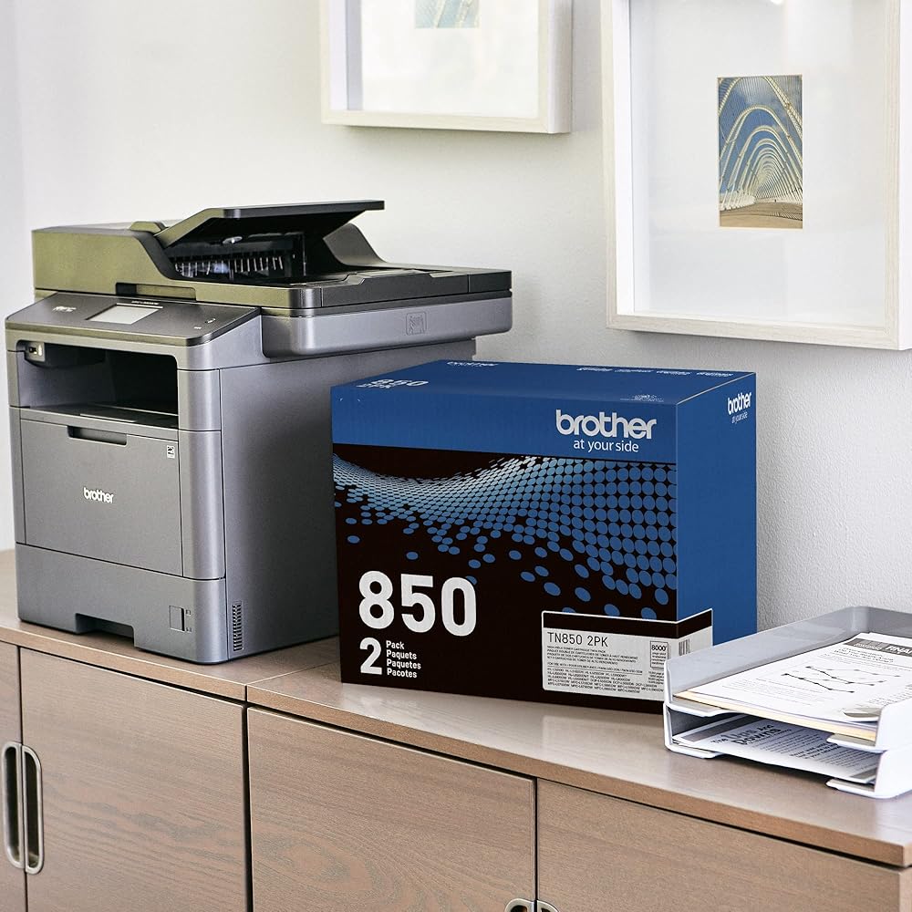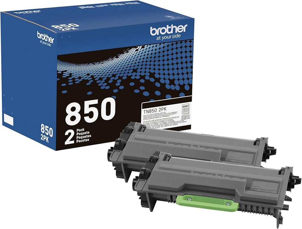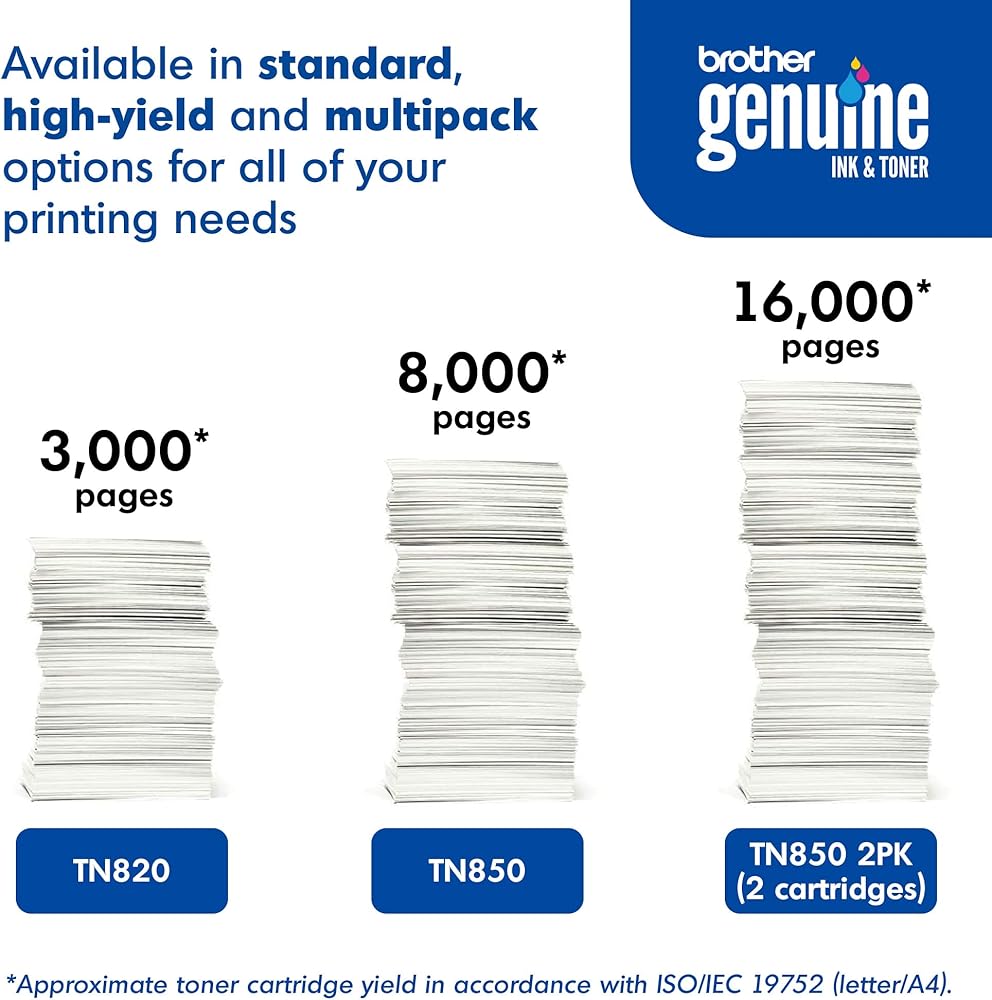 خرطوشة حبر سوداء أصلية عالية الإنتاجية من BROTHER PACK TN850 2PK: تحتوي على خراطيش حبر ليزر سوداء TN850 توفر جودة طباعة ليزر احترافية لما يصل إلى 8000 صفحة لكل خرطوشة (1) وما يصل إلى 16000 صفحة إجمالية. (1)