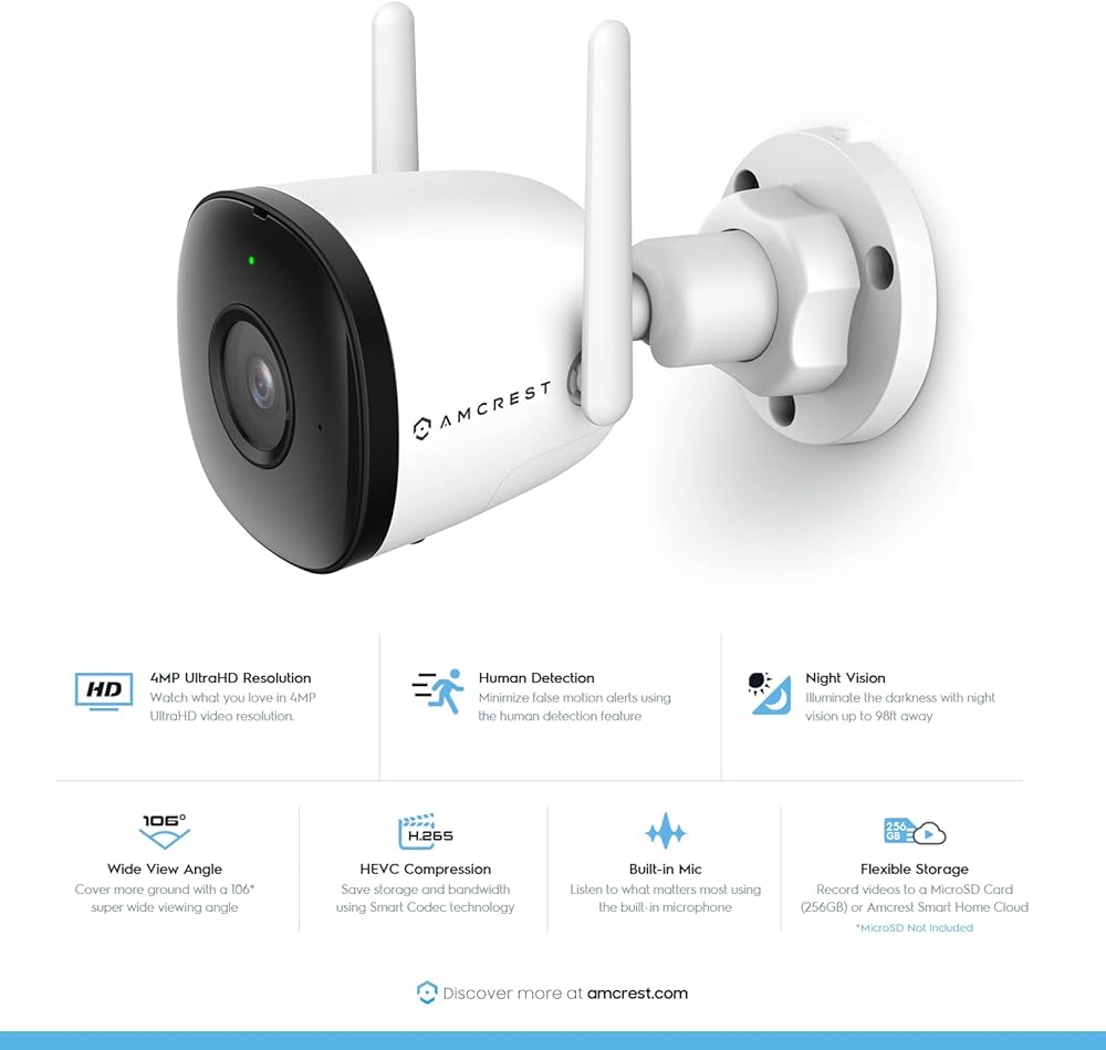 كاميرا Amcrest SmartHome 4MP خارجية واي فاي كاميرا مراقبة خارجية 4 ميجابكسل، رؤية ليلية 98 قدمًا، ميكروفون مدمج، 106 درجة FOV، عدسة 2.8 مم، تخزين MicroSD (يُباع بشكل منفصل)، ASH43-W (أبيض)