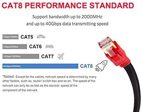 توافق عالمي: كابل إيثرنت Cat 8 متوافق مع CAT7/CAT6/CAT5E/5، المزيد والمزيد من المنتجات الذكية (الذكاء الاصطناعي)، مثل Amazon Alexa, Google Home, Apple Siri وغيرها من منتجات المنزل والمكتب الذكي تتطلب شبكة عالية السرعة. كما أنه أفضل لألعاب بلاي ستيشن 4 وإكس بوكس وخادم البيانات كلاود ولوحات التوصيل وغيرها من تطبيقات الشبكات عالية الأداء