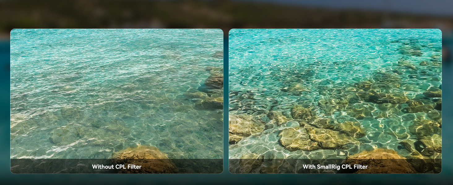 وظيفة مرشح CPL: يمكن لمرشحات الاستقطاب الدائرية القضاء على الانعكاس من الأسطح غير المعدنية (مثل البحيرات والنوافذ والشلالات والزجاج والمباني وما إلى ذلك) وبالتالي تحسين تشبع الصورة. يمكن أيضًا تحسين تباين الصورة وتشبعها، مما يجعل السماء أكثر زرقة والمياه أكثر وضوحًا.
