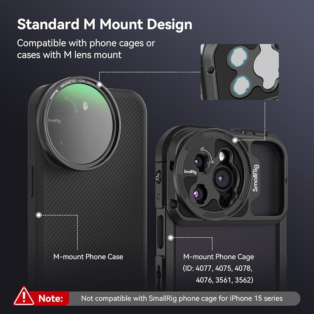 【تصميم حامل M قياسي】حلقة الفلتر المغناطيسية مناسبة لجميع أقفاص/حافظات الهاتف المزودة بحامل M. على سبيل المثال، مناسب لقفص الهاتف SmallRig 4077 / 4075 / 4078 / 4076 / 3561 / 3562، لجراب الهاتف Moment M، وما إلى ذلك. يعتمد الحامل تصميمًا سريع التحرير لسهولة التركيب.