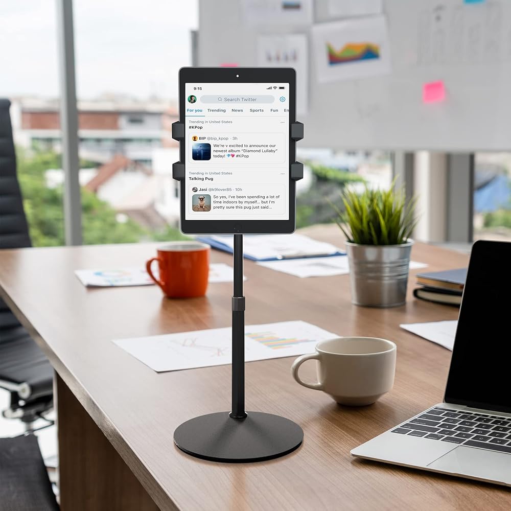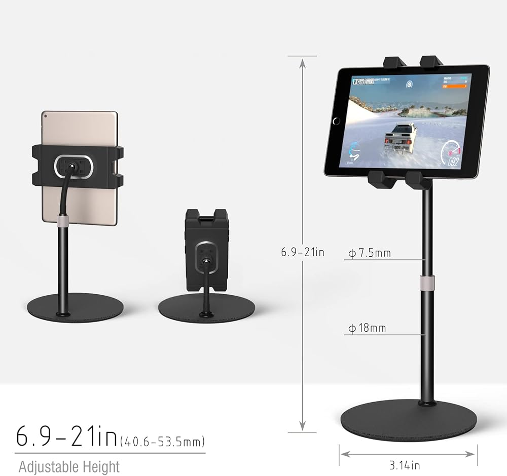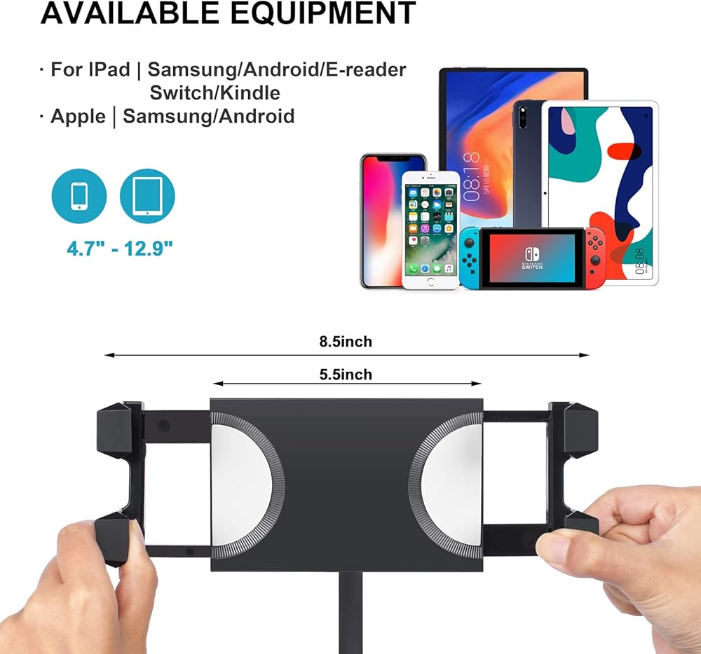 Suitable for 4.7"-12.9" cellphones, tablets, such as iPad Pro 12.9/10.5/9.7, iPad 1/2/3/4, iPad Air 2, iPad Mini 1/2/3/4, Surface Pro series, Samsung Galaxy Tab series, and so on, no need to remove phone case while using. The mount Width Adjustable from 5.5" to 8.5"