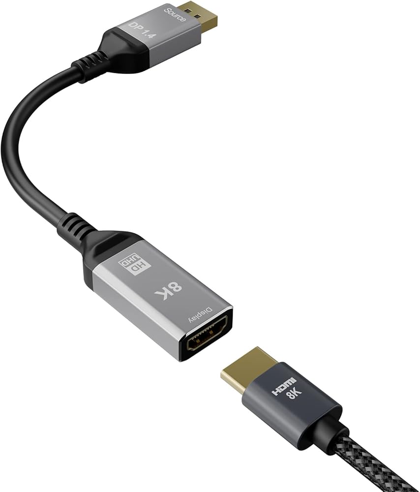 كيبل منفذ عرض 1.4 إلى HDMI 2.1 الترا اتش دي 8 كيه ذكر إلى أنثى، أثناء الاستخدام، يرجى توصيل كيبل HDMI m/m من HDMI أنثى إلى شاشات اتش دي ام اي/ تلفزيونات اتش دي ام اي، المصدر والعرض: