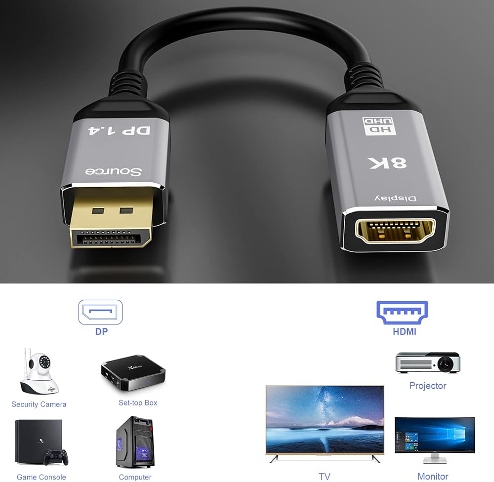 كيبل اتجاهي. لا يمكن توصيله من كمبيوتر HDMI إلى شاشات العرض الخاصة بك. كيبل منفذ عرض إلى HDMI 8K، يمكن توصيله بسهولة من أجهزة الكمبيوتر المكتبية/اللاب توب المزودة بمنفذ عرض إلى تلفزيون HD/شاشة/جهاز عرض مع واجهة HDMI، حتى تتمكن من تحقيق تجارب شاشة كبيرة في شاشات HDMI الخارجية. أثناء الاستخدام، يلزم وجود كابل HDMI ذكر إلى ذكر للتوصيل من منفذ HDMI أنثى إلى منفذ HDMI أنثى لتلفزيون HDMI الخاص بك