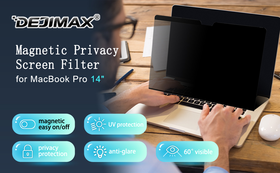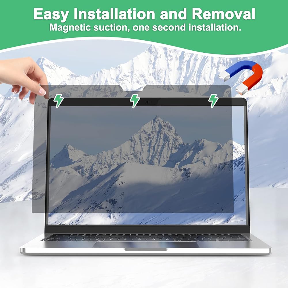 【شاشة خصوصية مغناطيسية لجهاز ماك بوك برو 14 انش】 ببساطة ضع شاشة الخصوصية على طول الجزء العلوي من جهاز ماك بوك الخاص بك ودع المغناطيسات تعلق على طول الجزء العلوي. لا حاجة لوضع صعب أو شريط فوضوي أو لاصق ضار. صمغ إعادة التدوير الموجود في الأسفل عبارة عن خليط لربط شاشتك. يمكن إزالته وإعادة تثبيته بسهولة عند الحاجة. يرجى ملاحظة أنه عند توصيل شاشة الخصوصية، لن يغلق اللاب توب الخاص بك تمامًا، ولكن وضع النوم لا يزال مدعومًا.