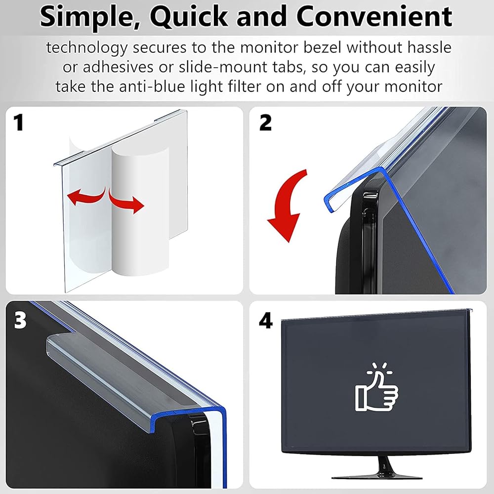 Easy Installation: Easy to install, just remove the film on both sides of the blue light blocker on the computer screen after cleaning the monitor. suspend the protector on the monitor. No paste, no bubbles.