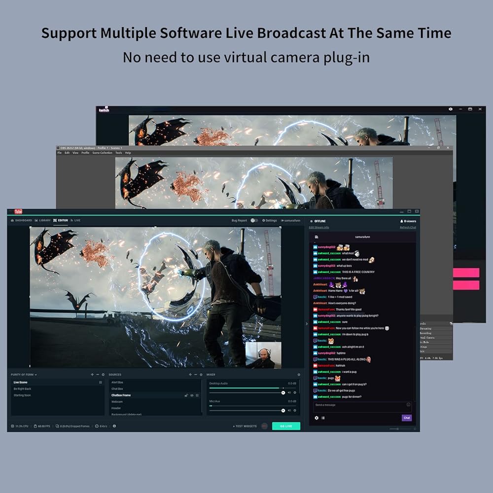【سيناريوهات استخدام واسعة】بطاقة التقاط الفيديو مناسبة لمجموعة متنوعة من سيناريوهات البث المباشر، مثل البث المباشر للألعاب، والبث المباشر للكاميرا، والجراحة الحية، ومؤتمرات الفيديو وما إلى ذلك. علاوة على ذلك، تدعم بطاقة الالتقاط هذه البث المباشر للبرامج المتعددة في وقت واحد، لا تحتاج إلى استخدام البرنامج المساعد للكاميرا الافتراضية