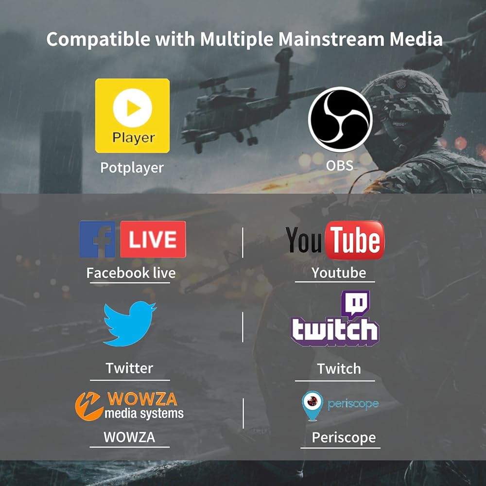 توافق قوي: وهو متوافق مع الإدخال والالتقاط لأجهزة XBOX وXbox One وPS4 وPS4 Pro وPS5 وSwitch وما إلى ذلك. يمكنه التقاط لعبة PS5 بدقة 4K واضحة للغاية بمعدل 60 إطارًا في الثانية و2K 144 إطارًا في الثانية. مناسب لـ OBS vMix VLC ومثالي للبث المباشر باستخدام Twitch Youtube Facebook Live Zoom، وما إلى ذلك