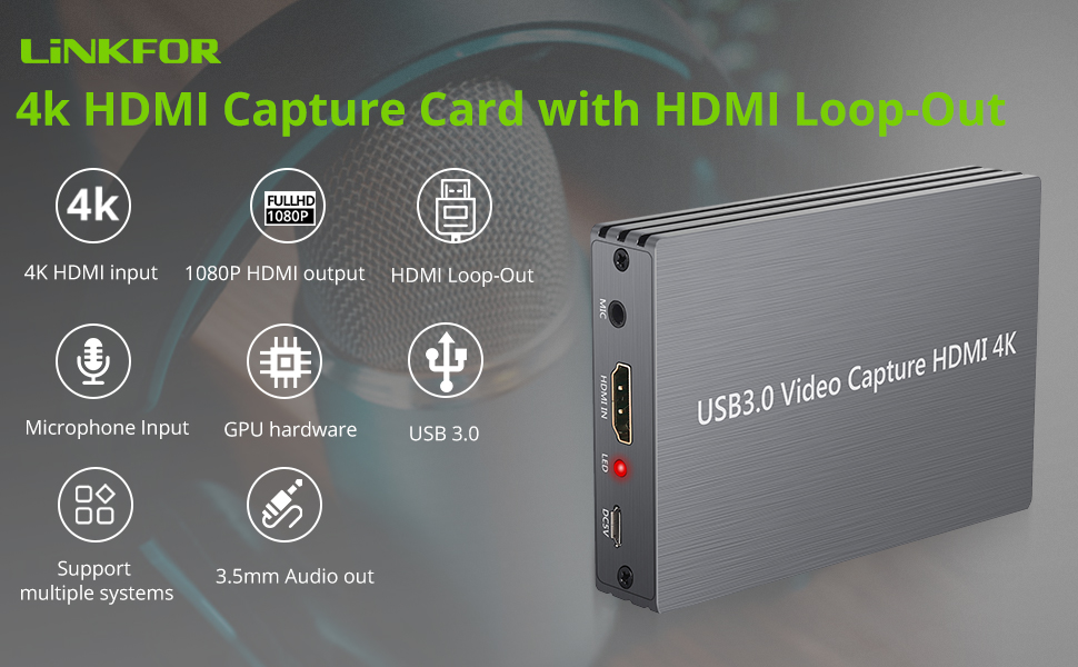 بطاقة التقاط اتش دي ام اي 4 كيه من مايكرووير مع مدخل ميكروفون محيطي HDMI وإخراج صوت، صندوق تسجيل تسجيل HDMI إلى USB 3.0 كاميرا فيديو حية تدعم شاشة 1080P بنظام تشغيل ويندوز ماك