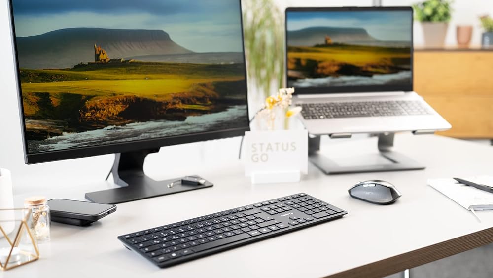 يمكن توصيل مجموعة سطح المكتب المسطحة الإضافية اختياريًا عن طريق البلوتوث أو باستخدام مستقبل USB اللاسلكي 2.4 جيجاهرتز. مفتاح منزلق على الماوس ولوحة المفاتيح يجعل التبديل بين لعب الأطفال. يسمح ذلك، على سبيل المثال، بتوصيل اللاب توب باستخدام البلوتوث وجهاز كمبيوتر إضافي ليتم توصيله لاسلكيًا والذي يتم تشغيله مع نفس مجموعة سطح المكتب.
