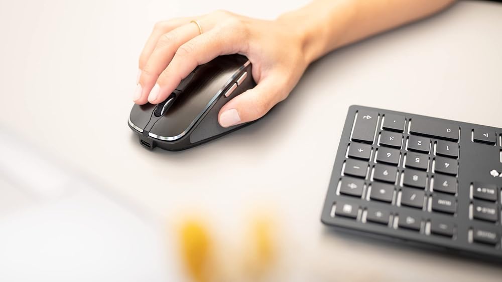 يستقر الماوس اللاسلكي بشكل جميل في يدك. الماوس اللاسلكي المريح، الأكثر ملاءمة للمستخدمين ذوي الأيدي المتوسطة إلى الكبيرة، يستقر بشكل مريح في اليد حتى عند العمل لساعات طويلة. تحتوي على أجزاء جانبية مطاطية مع مسند لإبهامك للاسترخاء. تسمح لك الأسطح المنزلقة ذات الحجم الكبير بتوجيه الماوس بسلاسة على المكتب دون الضغط على المعصم.