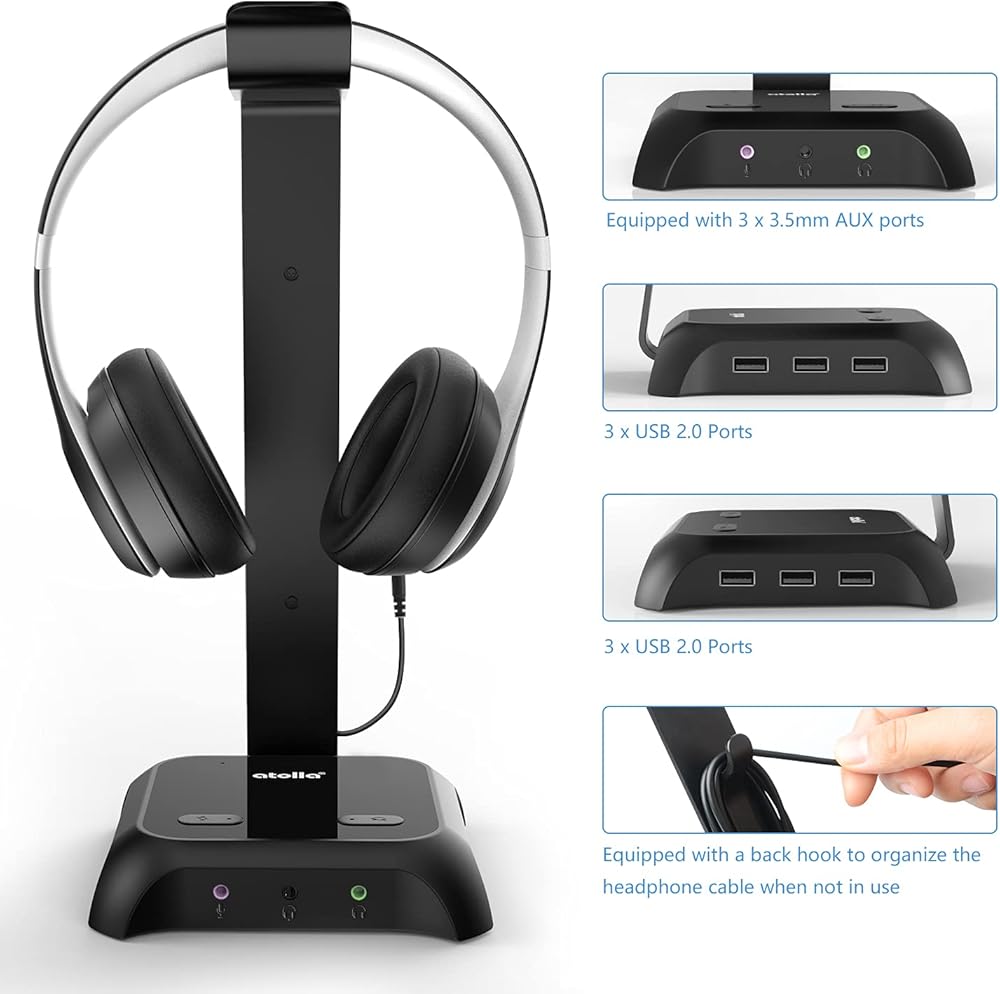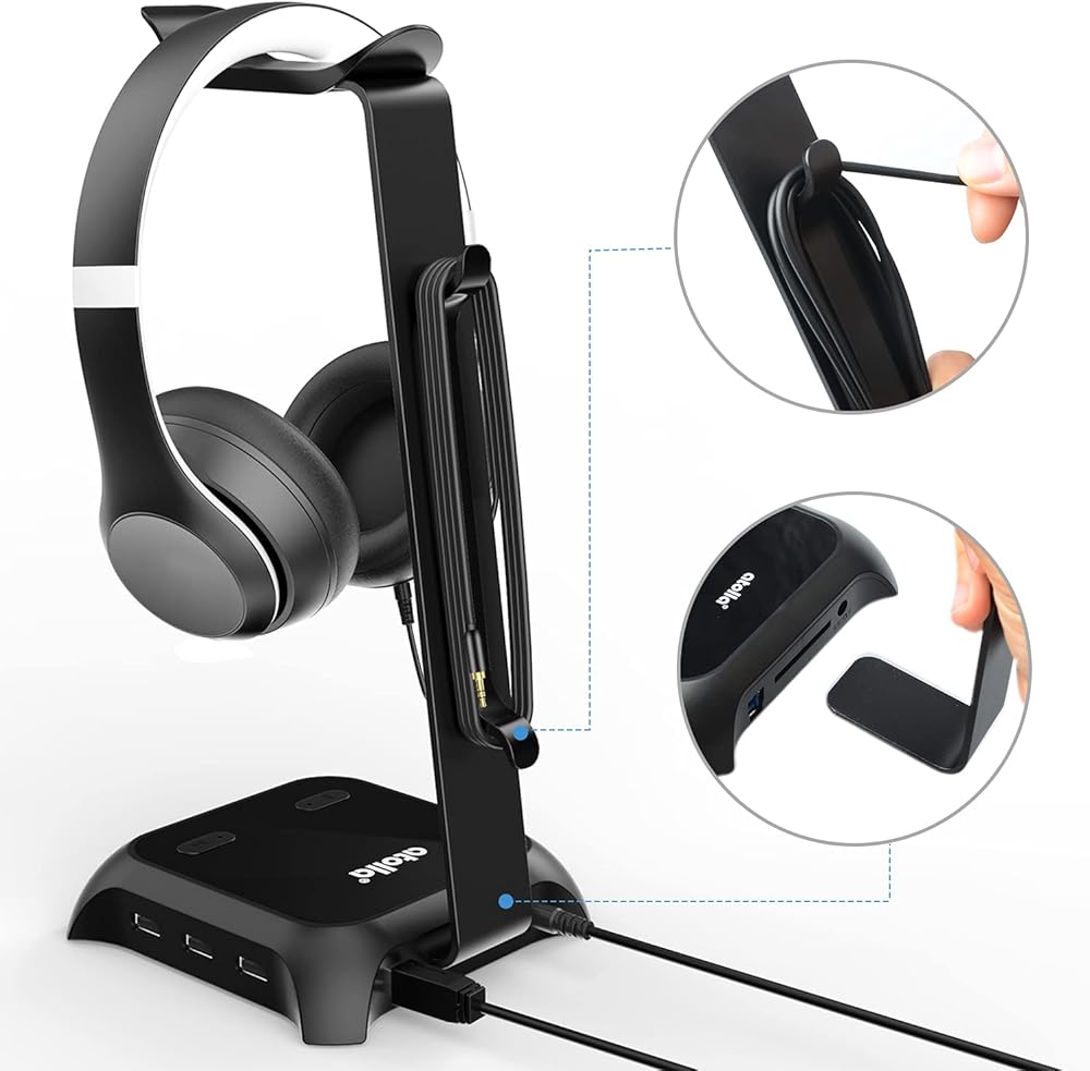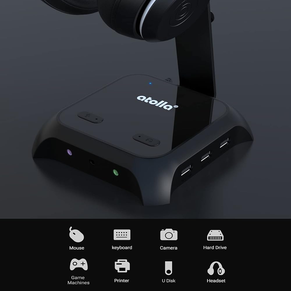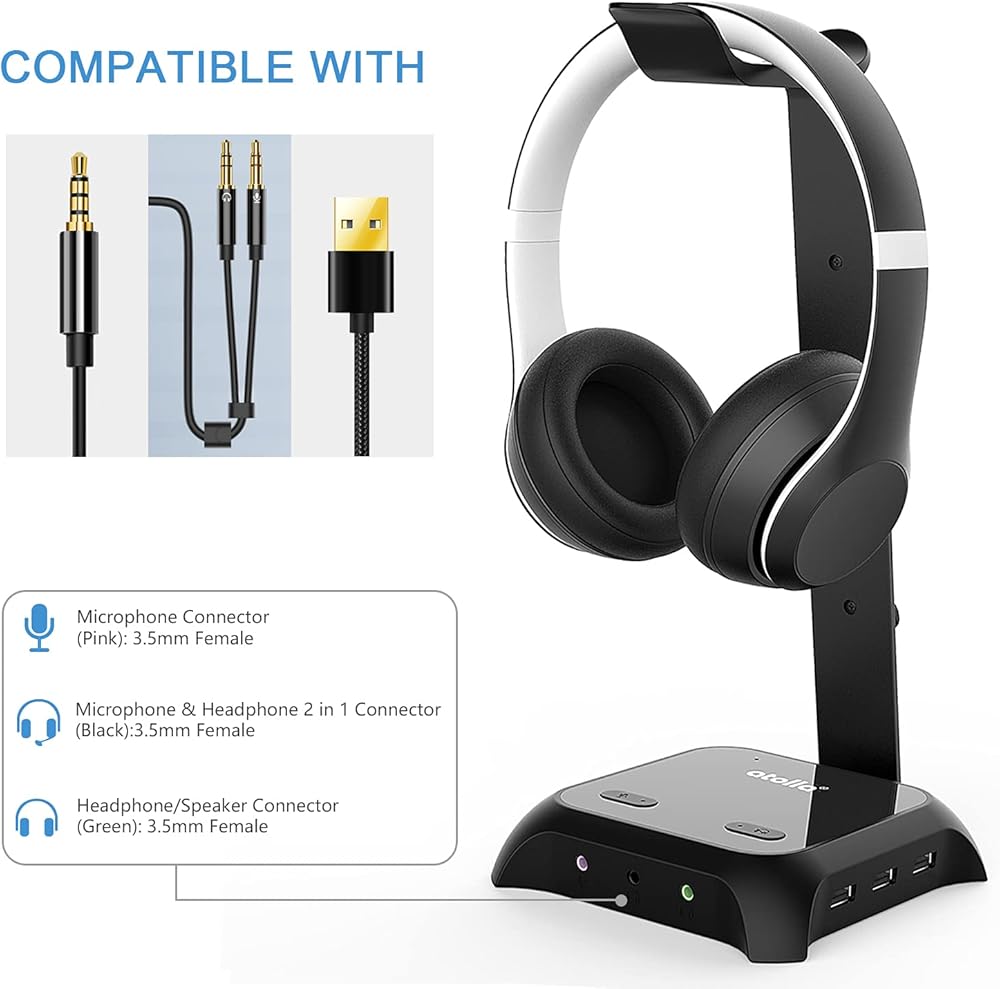 حامل سماعات أذن أتولا متعدد الوظائف، موزع USB مع حامل سماعة الرأس، محور USB يعمل مع 6 مخارج USB 3.5 مم مع مفاتيح تشغيل/إيقاف، ومحول طاقة 12 فولت/2.5 أمبير
