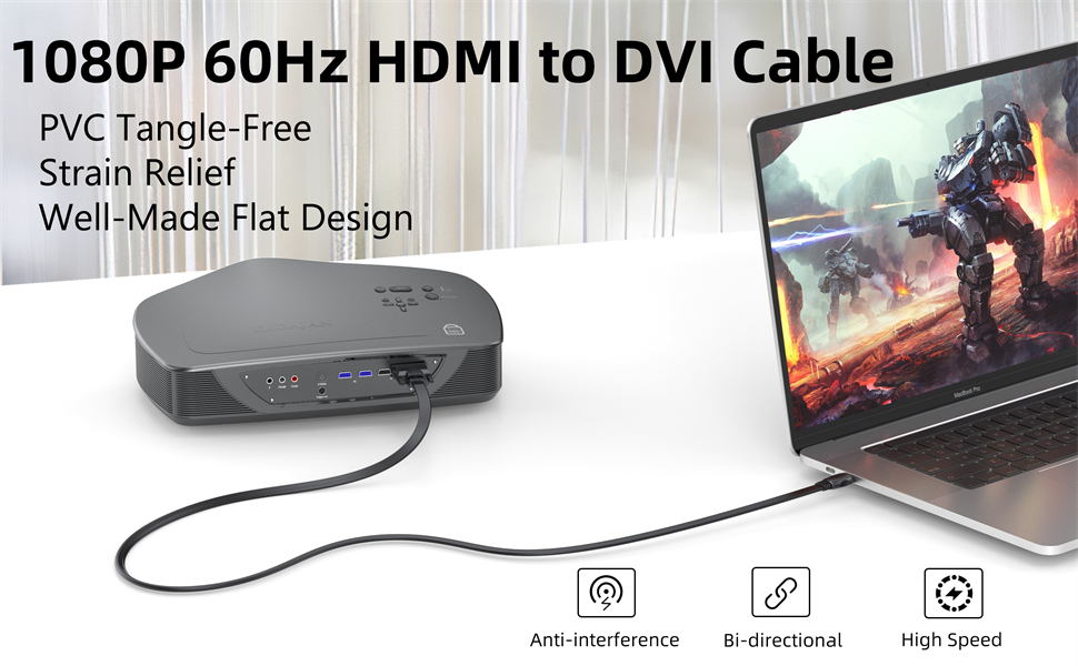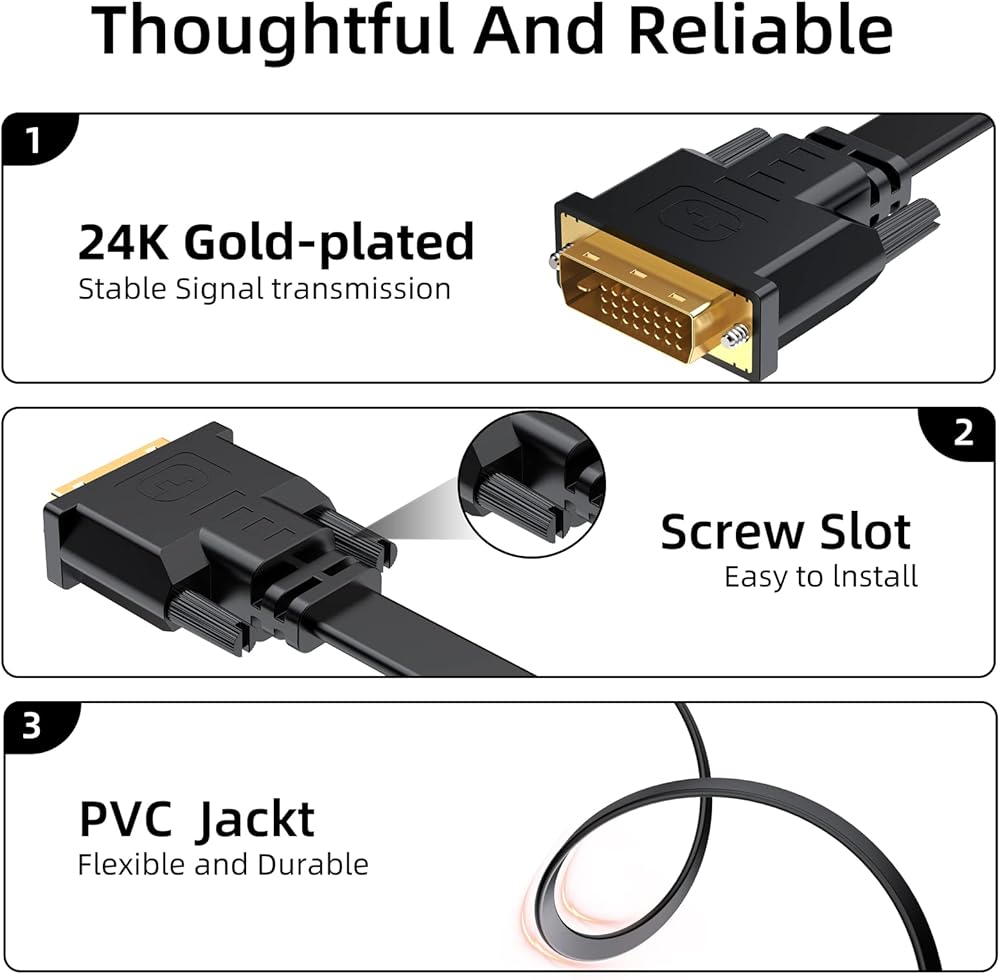 إبداعي ومتين: سلك مسطح خاص بتصميم خالٍ من التشابك، وواجهة DVI مطلية بالذهب مع براغي مشدودة بالأصابع، ومنفذ HDMI ذكر مطلي بالذهب مع تجاويف مضادة للانزلاق، مناسب بشكل أفضل على الحائط/المكتب. موصلات نحاسية عارية بالداخل ودرع متعدد الطبقات مع رقائق معدنية وجديلة، ترفض شاشة فلاش الشاشة السوداء، وتحمي من تداخل RFI وEMI