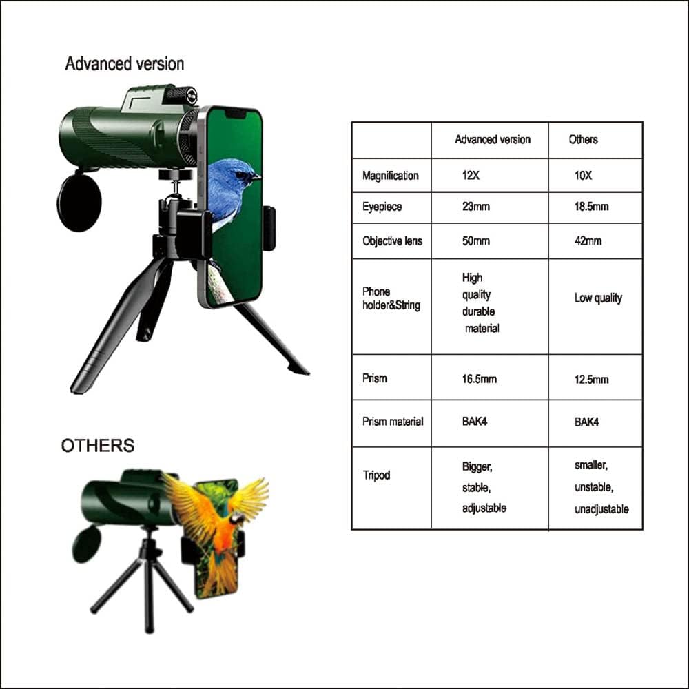 ✅ما تم تحديثه من منظار BrilliantHouse أحادي: تلسكوب أحادي العين من BrilliantHouse مجهز بتكبير 12X50، وعدسة عينية 23 مم، وعدسة موضوعية 50 مم، وعدسة منشورية 16.5 مم، ويأتي مع حامل ثلاثي أكبر وثابت وقابل للتعديل وحامل هاتف/خيط من مادة متينة عالية الجودة وحقيبة حمل متينة. طَرد. العناصر الأخرى في AMZ مجهزة فقط بتكبير 10X42، وعدسة عينية 18.5 مم، وعدسة موضوعية 42 مم، وعدسة منشورية 12.5 مم، وتأتي مع حامل ثلاثي القوائم أصغر وغير مستقر وغير قابل للتعديل وحامل/سلسلة هاتف من مواد منخفضة الجودة.