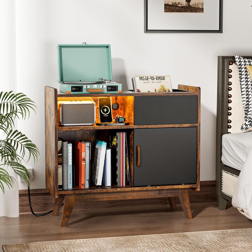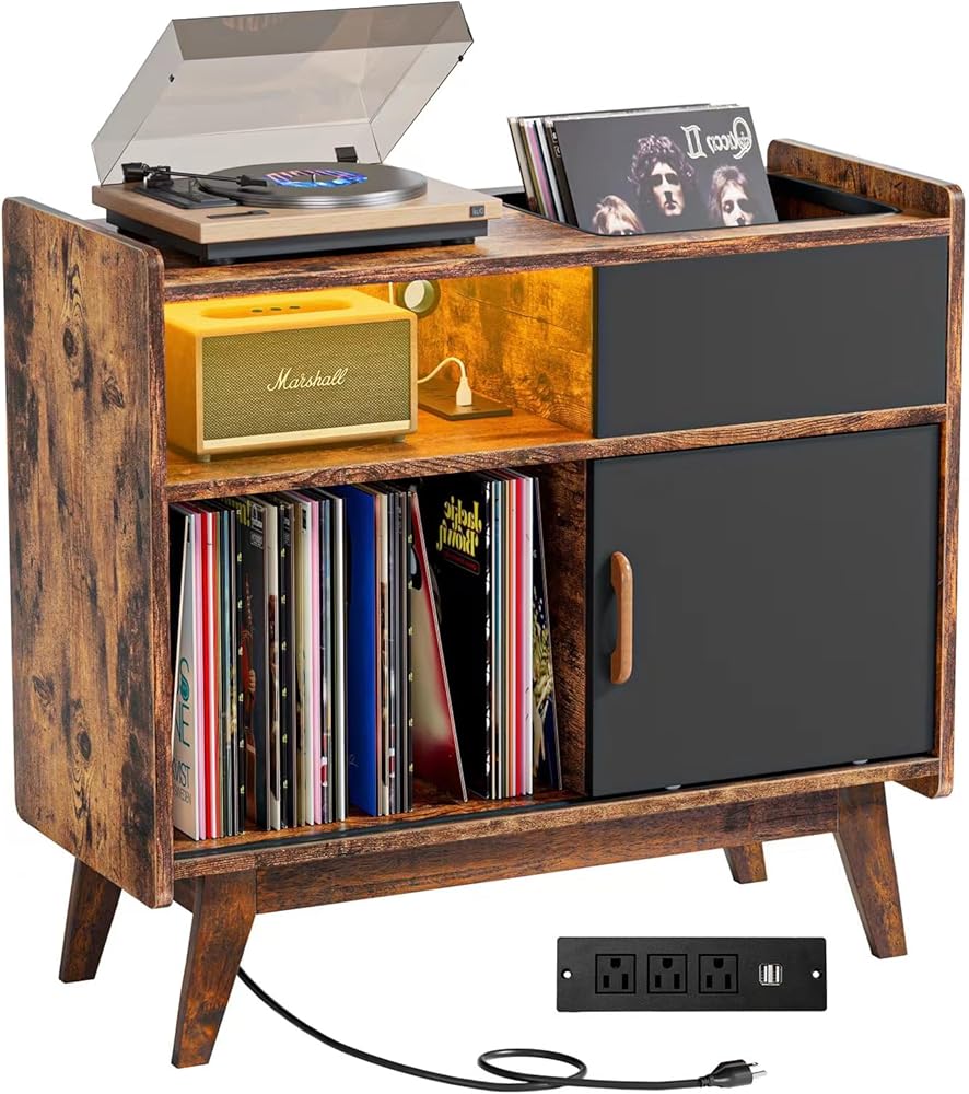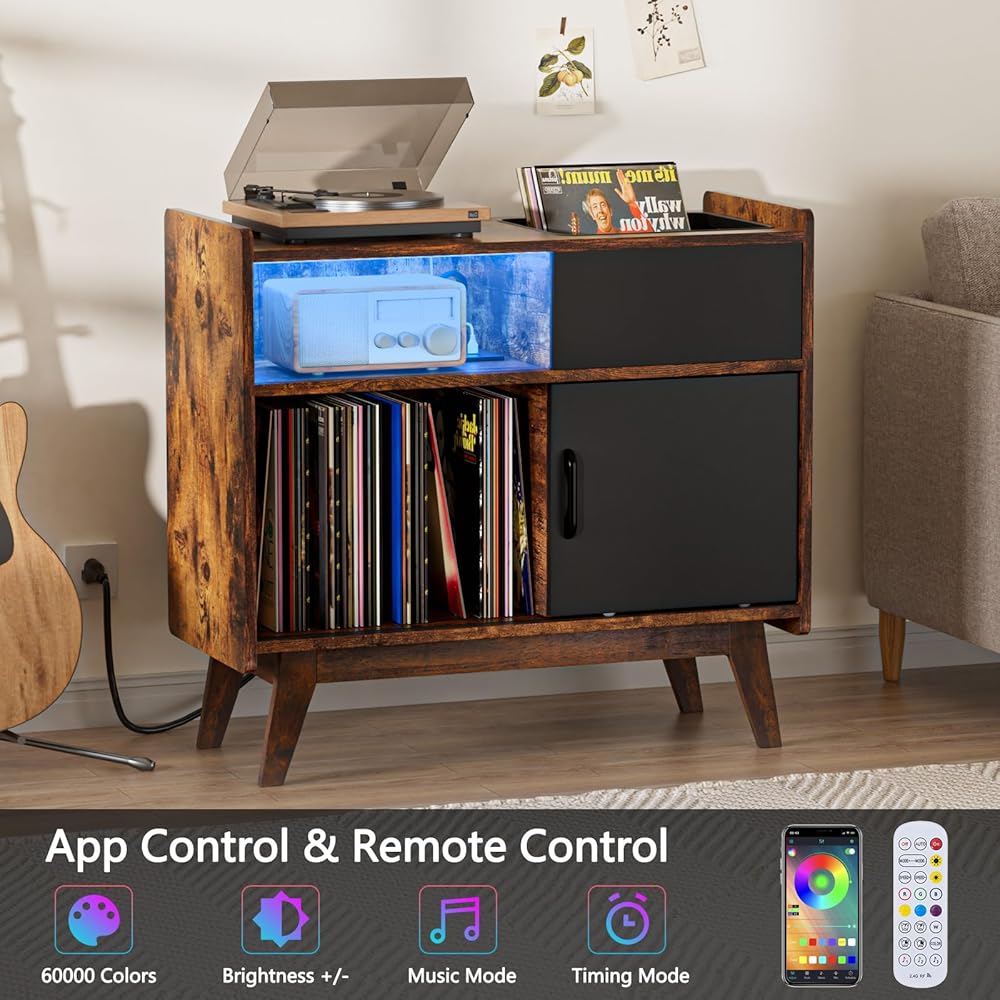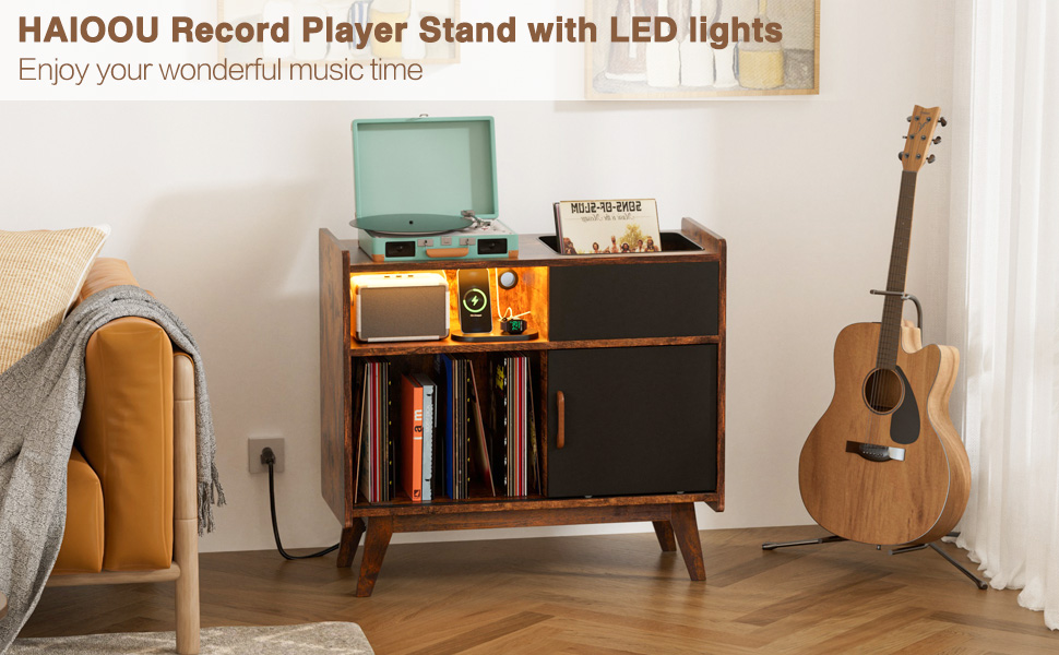 حامل مشغل تسجيلات HAIOOU مع مصابيح LED، خزانة تخزين كبيرة لسجلات الفينيل مع مخرج طاقة، حامل حامل القرص الدوار في منتصف القرن، رف تخزين سجل الألبوم مع أرجل خشبية للأقراص المضغوطة والمجلة والكتاب
