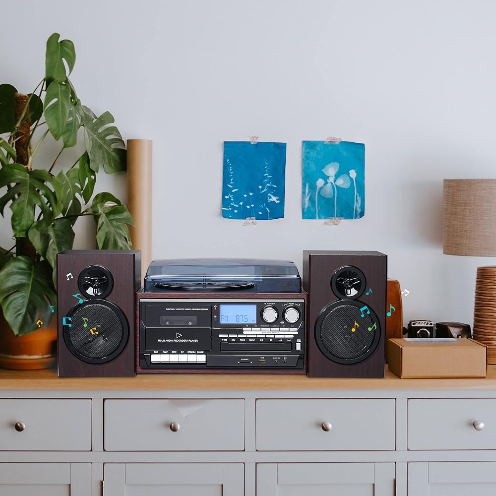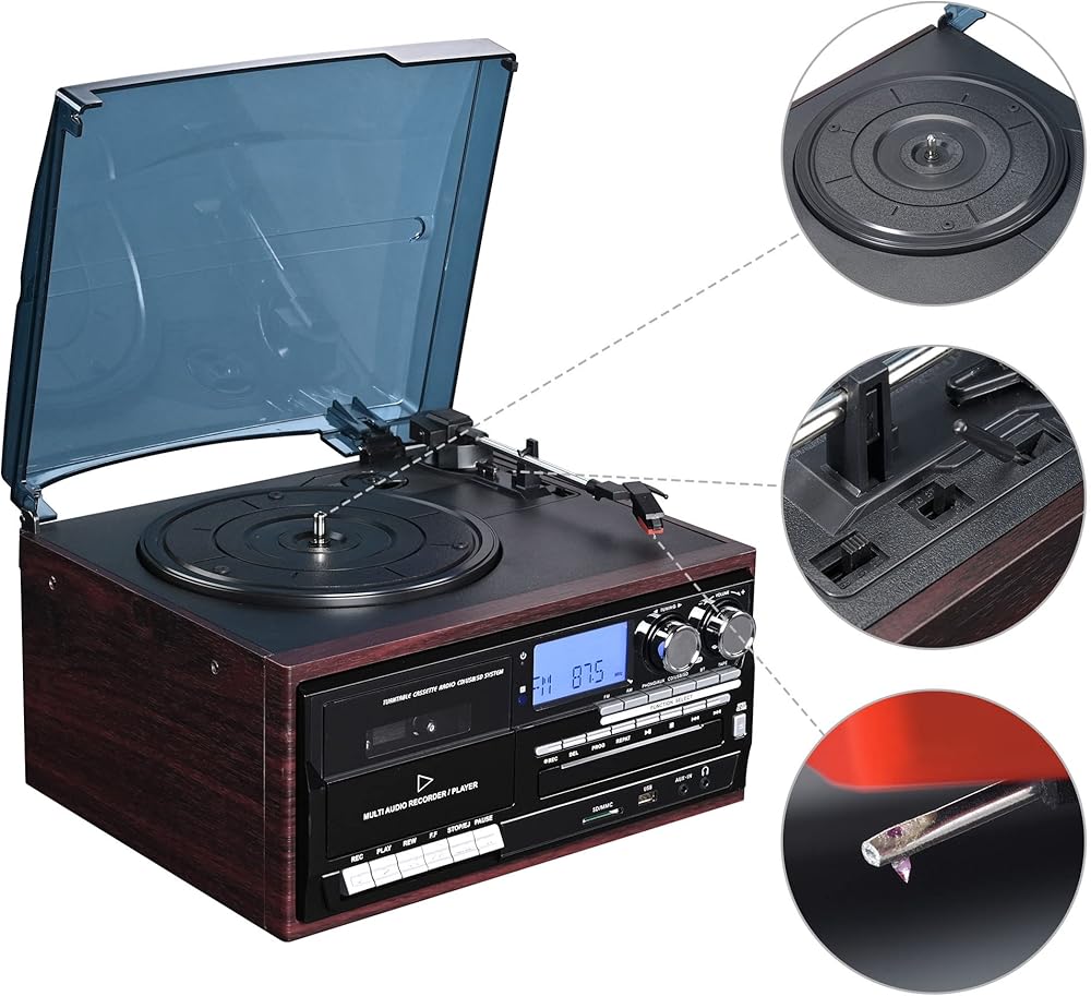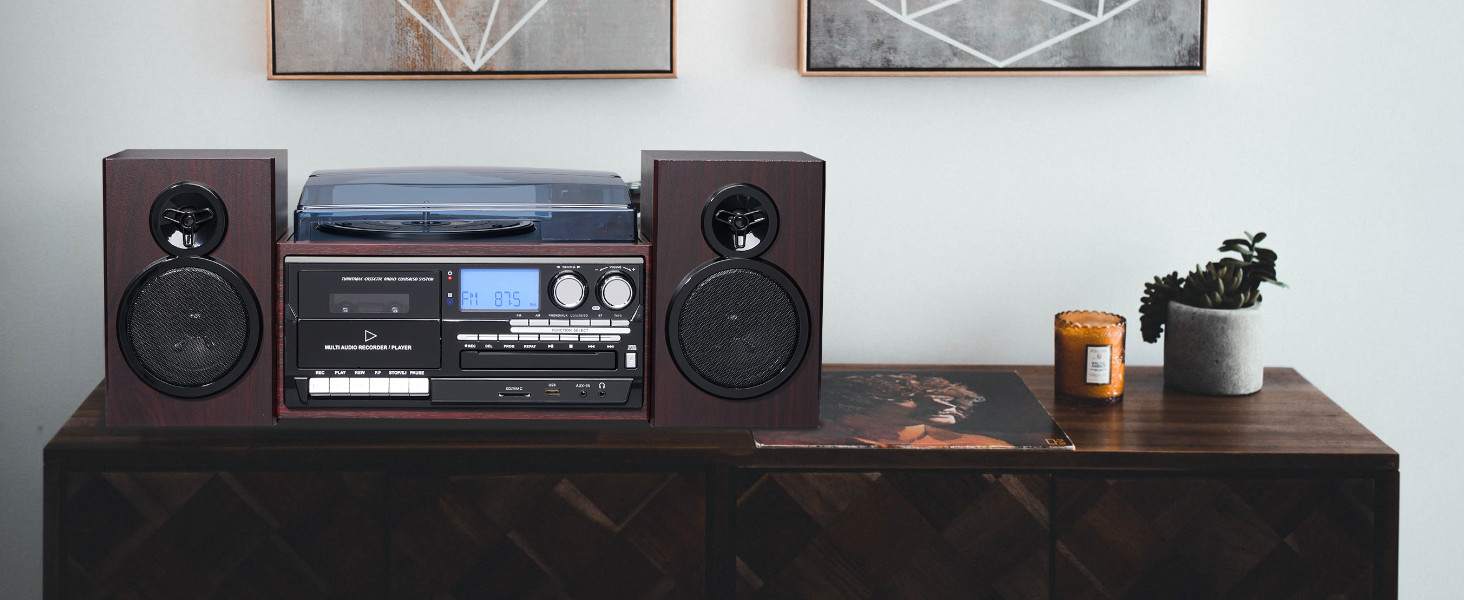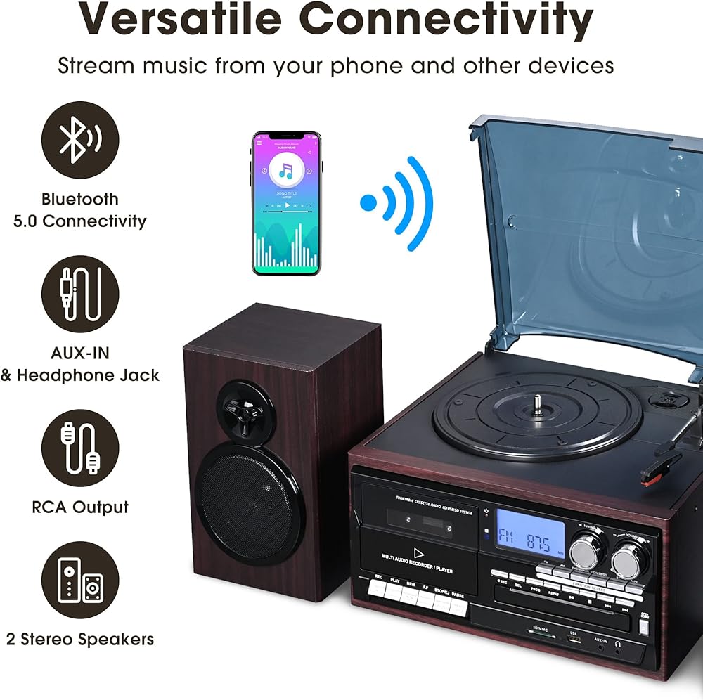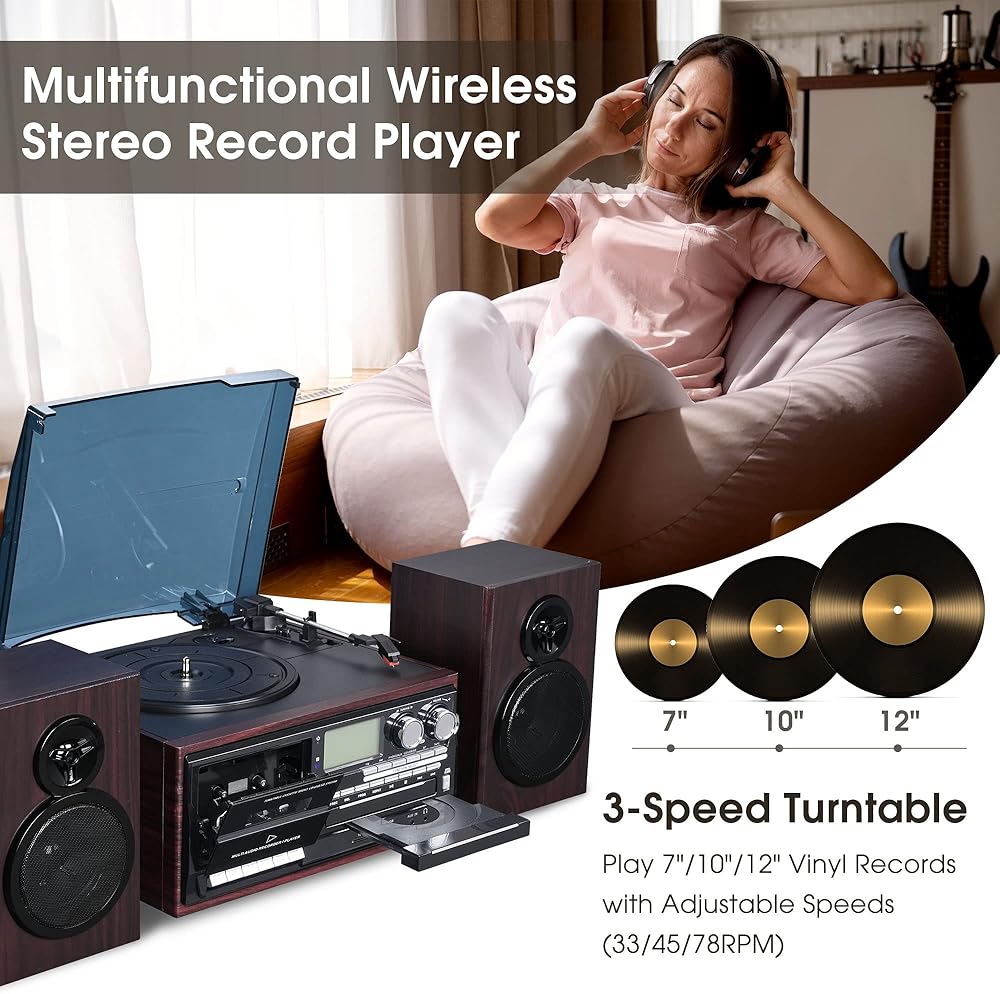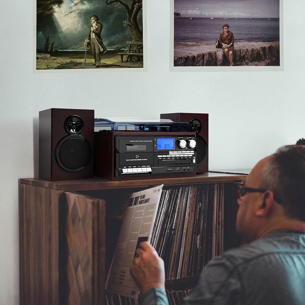 [عتيق ومتعدد الوظائف]: يجمع نظام مشغل تسجيل الستيريو اللاسلكي هذا بين التصميم الحنين ووظائف متعددة العصور، وتشغيل تسجيلات الفينيل 7 بوصة/10 بوصة/12 بوصة مع سرعات تشغيل قابلة للتعديل تبلغ 33/45/78 دورة في الدقيقة، جنبًا إلى جنب مع راديو ستيريو AM/FM والأقراص المضغوطة وأشرطة الكاسيت وصوت MP3 عبر USB أو SD أو أجهزة أخرى