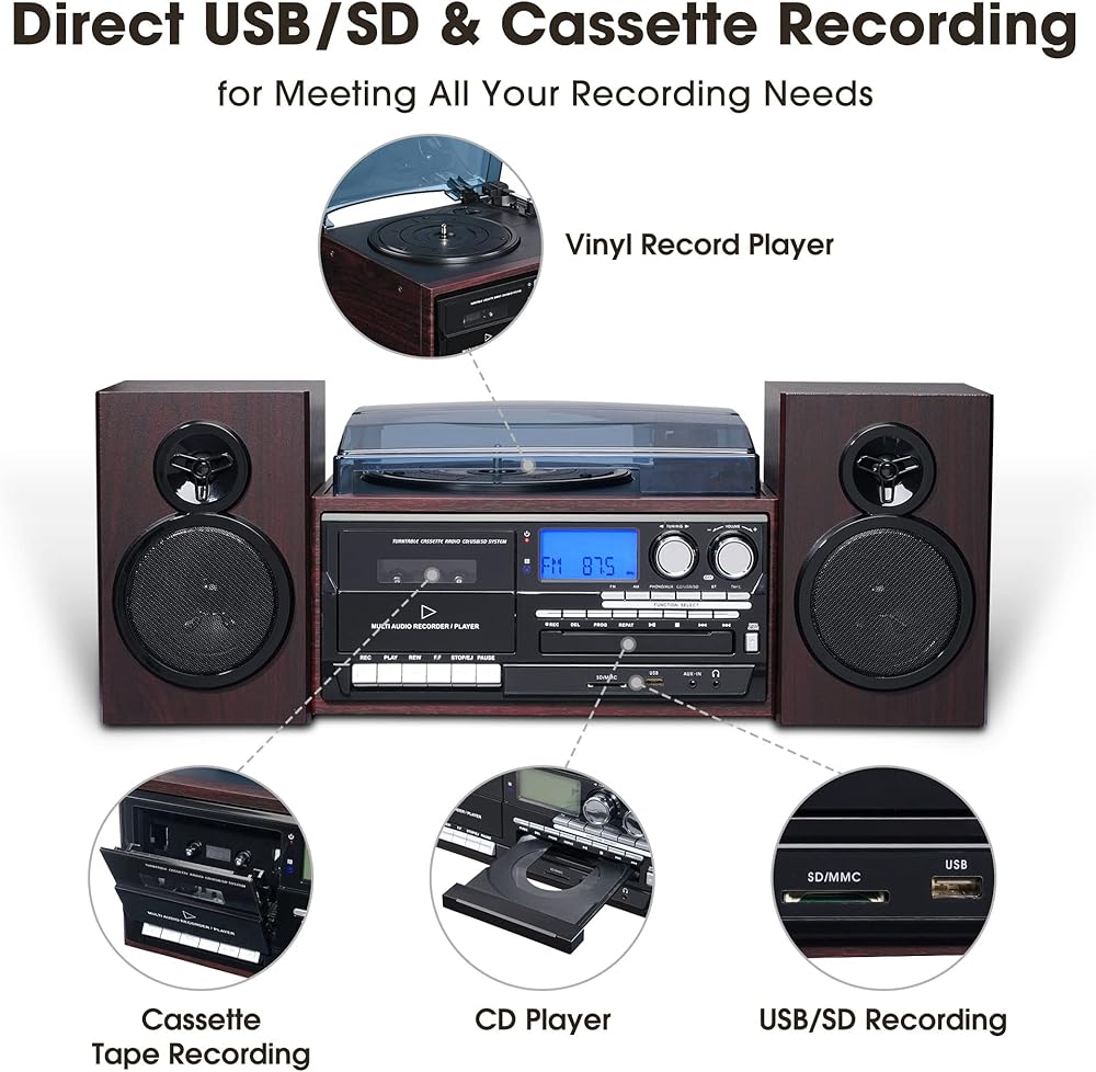[وظيفة التسجيل]: تتميز بتسجيل USB/SD مباشر، إلى جانب وظيفة تسجيل كاسيت نادرة، مما يسمح بالتسجيل السهل من مصادر مختلفة بما في ذلك سجلات الفينيل أو الراديو أو الأقراص المضغوطة أو SD أو USB أو Aux إلى شريط كاسيت قابل للتسجيل، للتخصيص بالكامل خلق كاسيت جديد