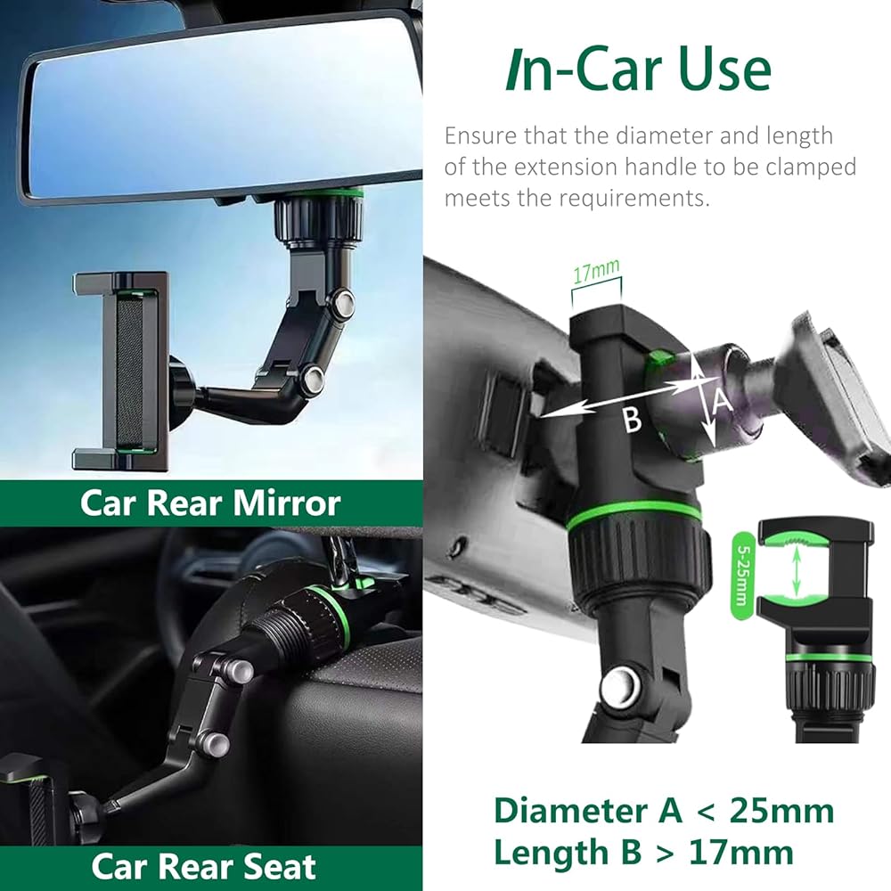 【ذراع تعديل طويل】صديق لمرآة الرؤية الخلفية الكبيرة. تناسب معظم المرايا الخلفية، حتى البيضاوية والدائرية والسميكة للغاية مع الأزرار ومسجل القيادة. يمكن تعديله دون حجب الرؤية. بغض النظر عن مدى صعوبة الطريق، فإن تصميم حامل الهاتف يبقي هاتفك ثابتًا في مكانه.