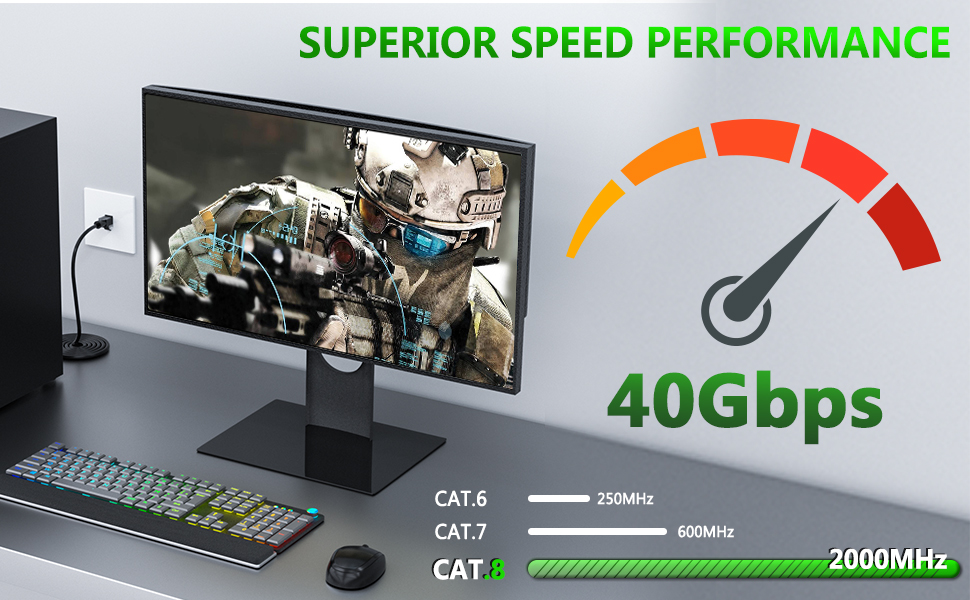 أداء فائق و28AWG: كابل شبكة Cat 8 بالمقارنة مع كابلات إيثرنت 32AWG الأخرى، 28AWG Cat8 أكثر سمكًا وأسرع بكثير ومستقرًا في نقل البيانات، وهو مناسب تمامًا لمنتجات الذكاء الاصطناعي الذكية. تم تصميم كابل Cat 8 المُصنف من UL لدعم تطبيقات 25GBASE-T و40GBASE-T، وهو مناسب لشبكات LAN الخاصة بالمؤسسات الصغيرة أو المتوسطة، خاصة للاتصالات البينية من مركز البيانات إلى الخادم.