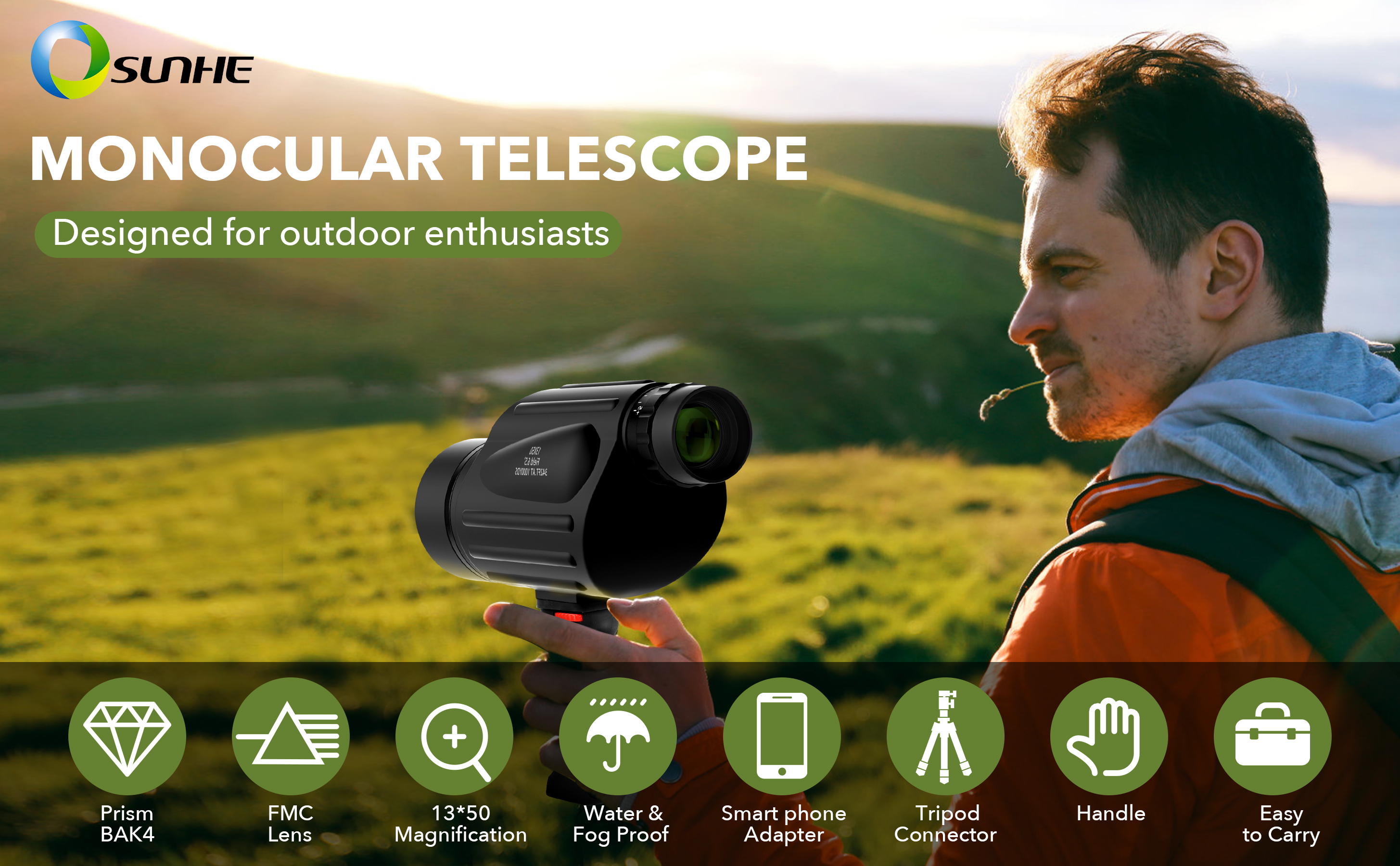 تكبير عالي الطاقة 13x50: تكبير 13x، عدسة عينية 25 مم وعدسة شيئية 50 مم. عدسة كبيرة جدًا، وزاوية رؤية أوسع، وألوان زاهية، وإجهاد أقل للعين. يقدم تلسكوب أحادي المنشور عالي الطاقة Sunhe13x50 صورًا مشرقة وواضحة ضمن نطاق 342 قدمًا/1000 ياردة من الحفلات الموسيقية.