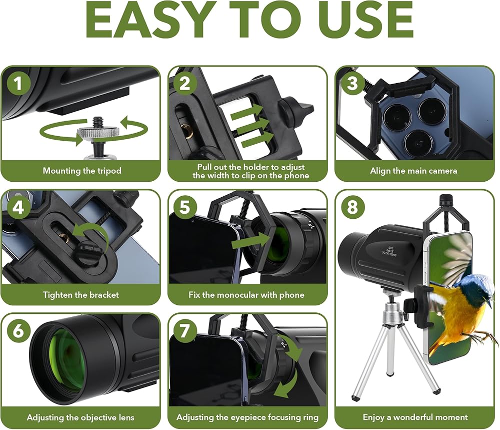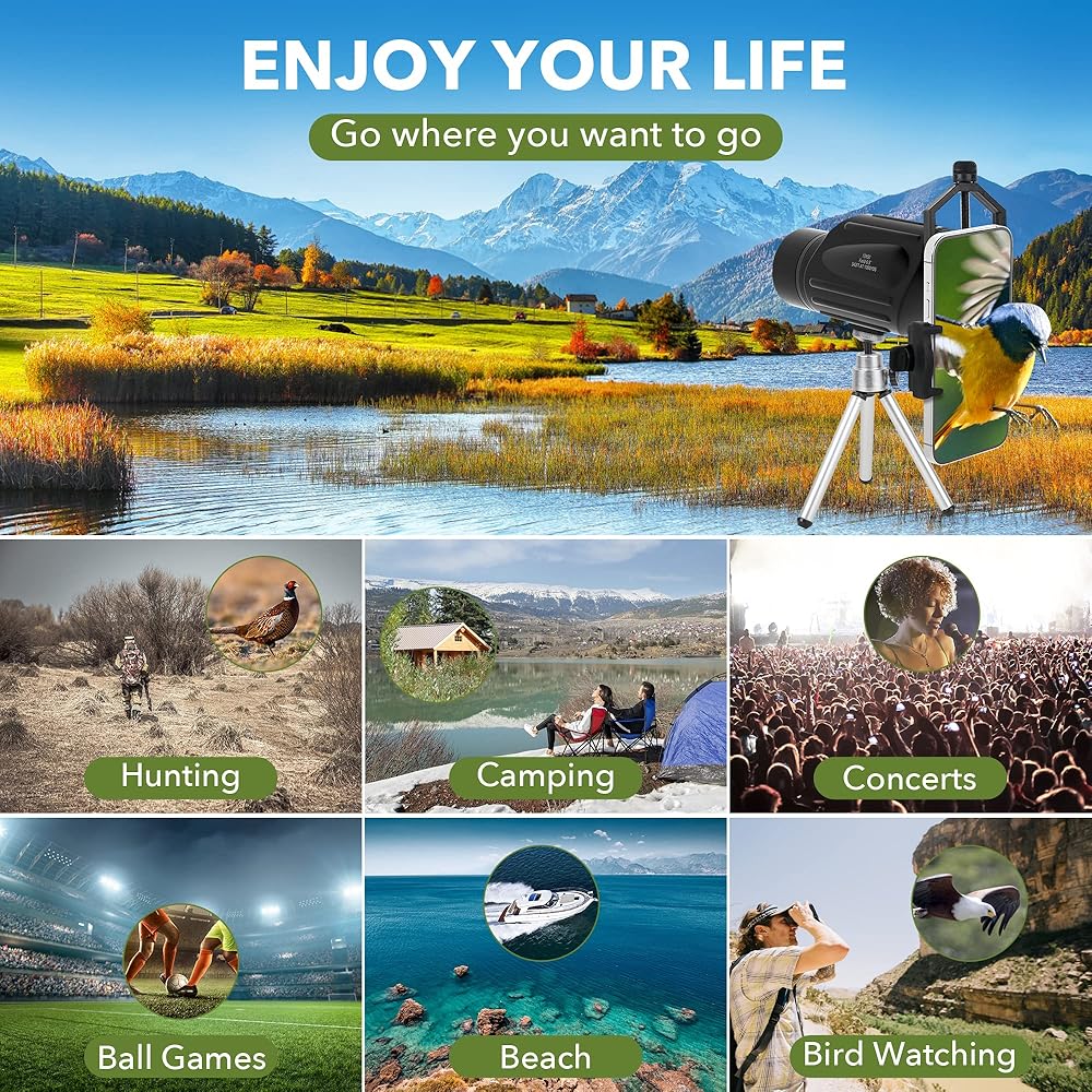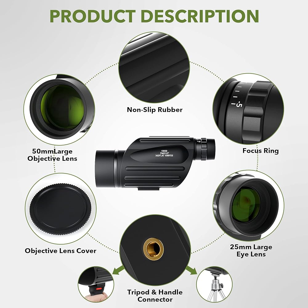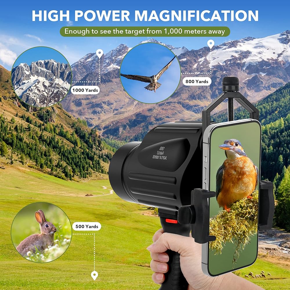 【هدايا مثالية 】منظار أحادي عالي القوة قوي ومحمول، مع مقبض مريح وحافظة مطاطية غير قابلة للانزلاق لمنع المنظار من الانزلاق من اليد. تأتي العدسة مع لوحة قياس المسافة، من خلال الزاوية الأفقية/العمودية ومسافة الرؤية يمكن قياس المسافة الفعلية. حماية مقاومة للماء مملوءة بالنيتروجين IPX7، مما يوفر حماية ضد الماء والضباب والغبار والصدمات في أي بيئة قاسية. هدية مثالية للأصدقاء والأطفال والعائلة.