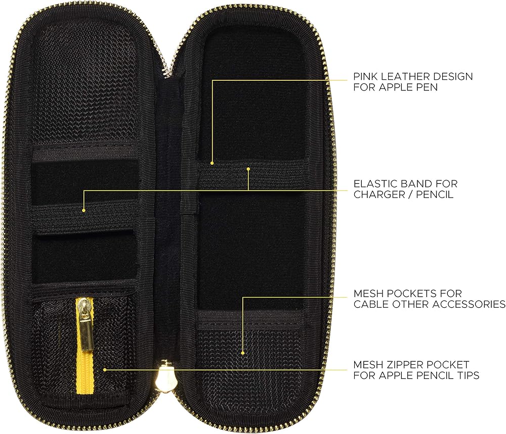 ❤ جيب شبكي مدمج وحزام مرن للحفاظ على قلم ابل الخاص بك في مكانه بأمان (يتوفر 5 أقلام كحد أقصى)؛ ثلاثة جيوب شبكية مفتوحة تسمح بتخزين الملحقات الصغيرة مثل كابل الشحن وسماعات الأذن ومحول قلم ابل.