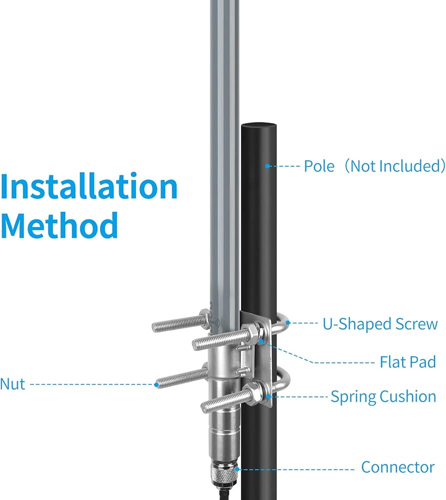 قائمة محتويات العبوة: هوائي من الألياف الزجاجية × 1؛ مجموعة التركيب × 1؛ كابل KMR200 بطول 3 أمتار × 1؛ محول SMA × 1