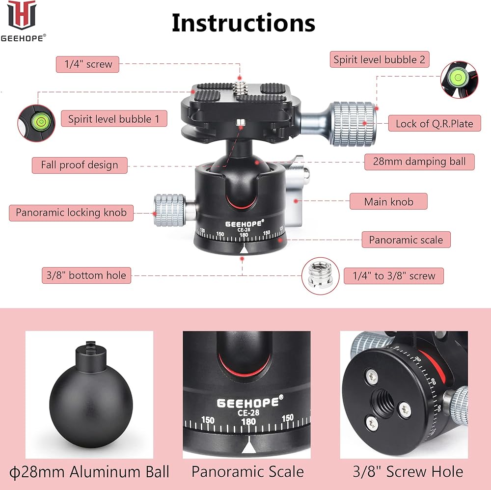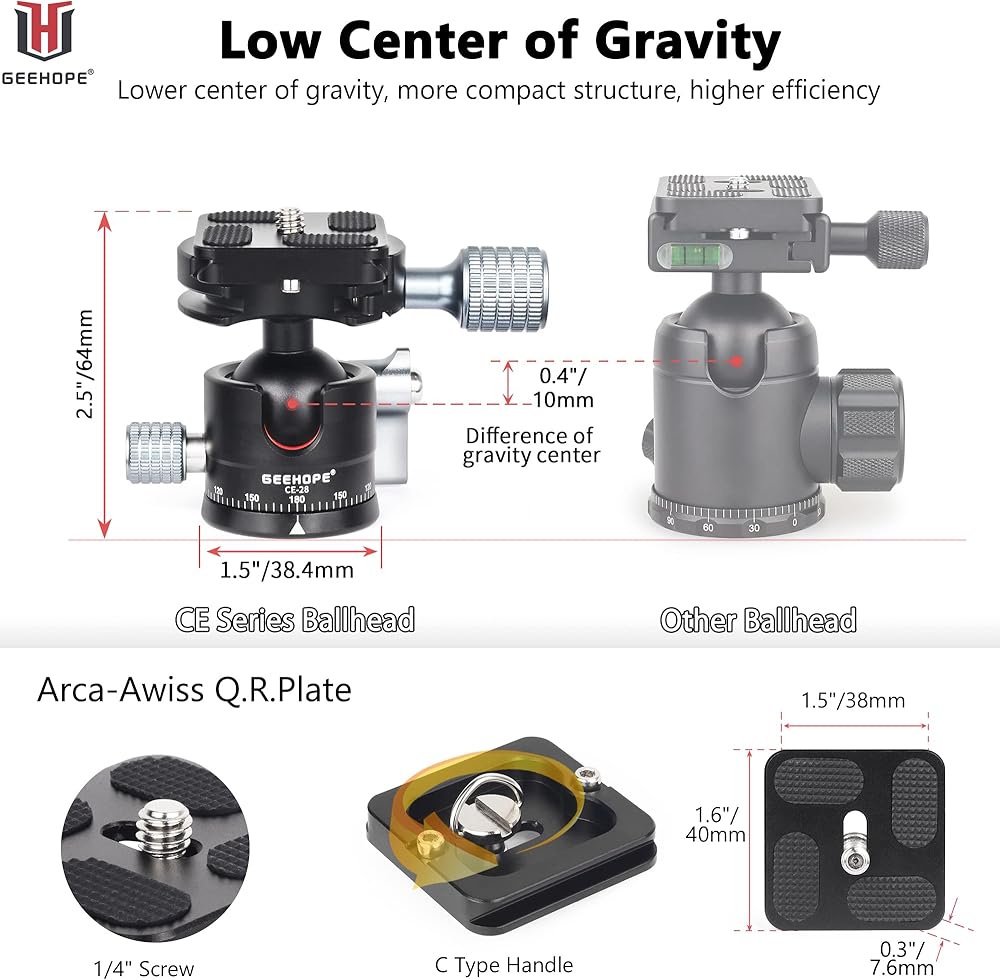 راس كروي ثلاثي القوائم من جيهوب CE-28 براس كروي معدني بانورامي عالمي 360 درجة لكاميرا دي اس ال ار ثلاثي القوائم احادي القوائم مع لوحة اركا سويس QR 28 ملم كرة 1/4 انش تحميل برغي 11.0 باوند/5 كغم