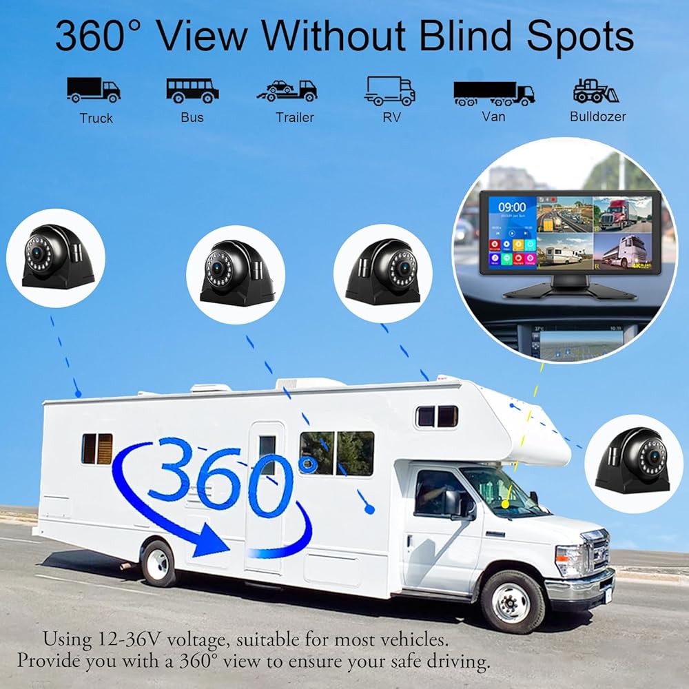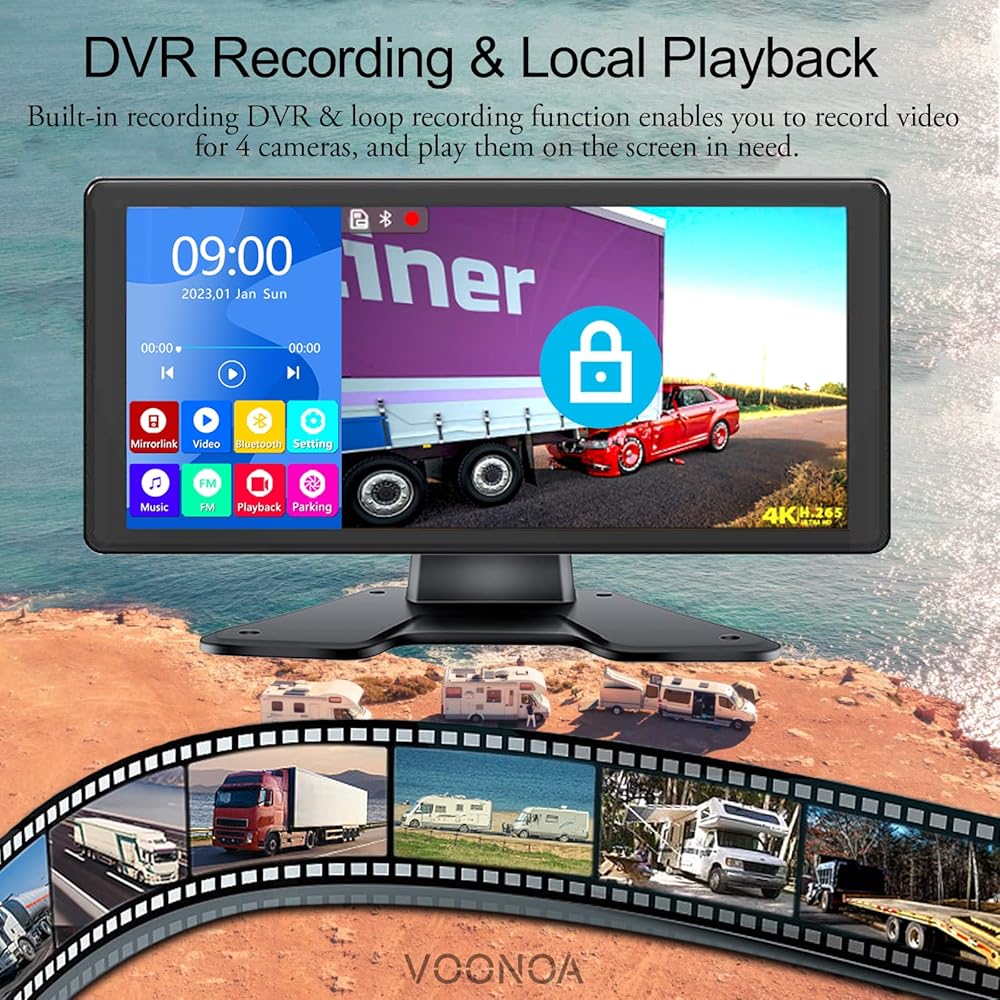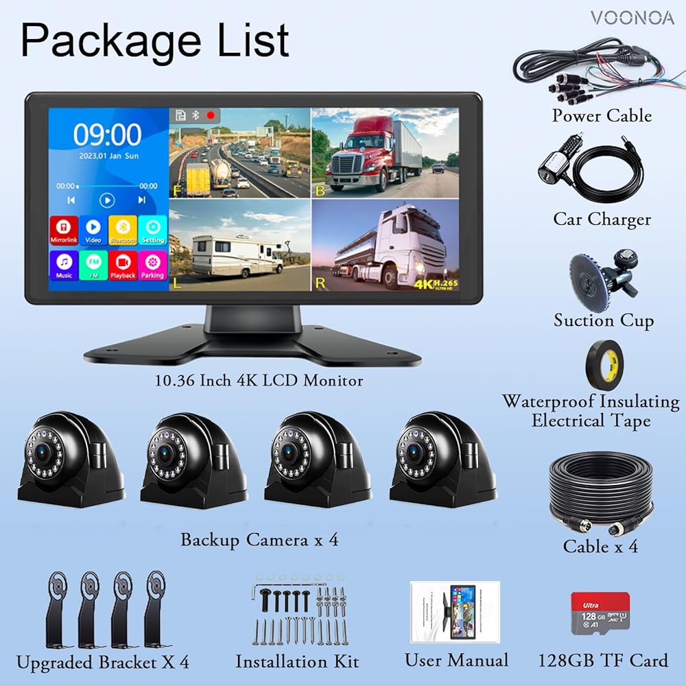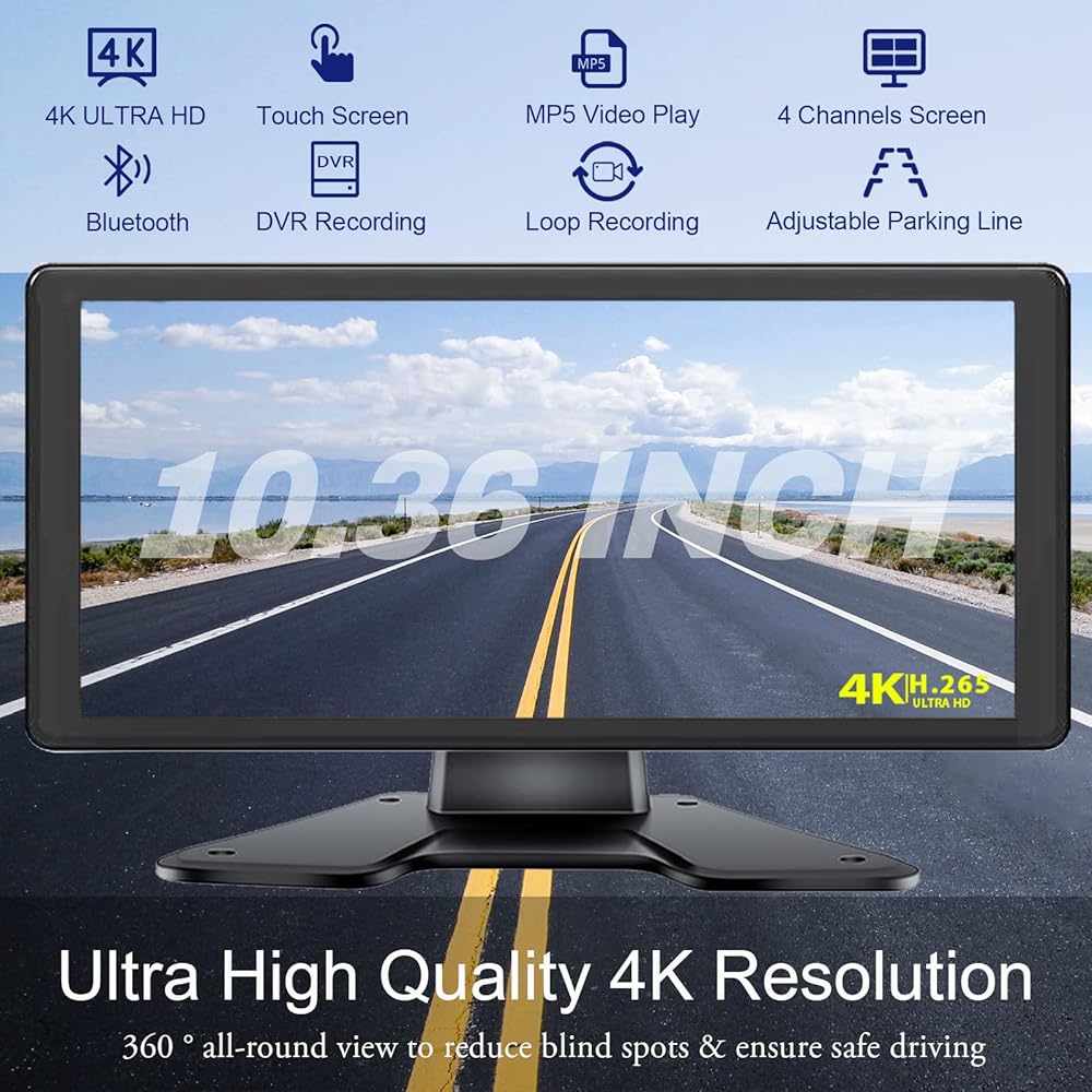 • 【شاشة 4K و4 كاميرا احتياطية 1080P】مع شاشة لمس 10.36 بوصة 4K فائقة الدقة 4 مقسمة و4 قطع من الكاميرا عالية الدقة 1080P، يمكنك الحصول على رؤية أكثر وضوحًا ونظافة وحيوية على الطريق للحصول على متعة السفر القصوى.