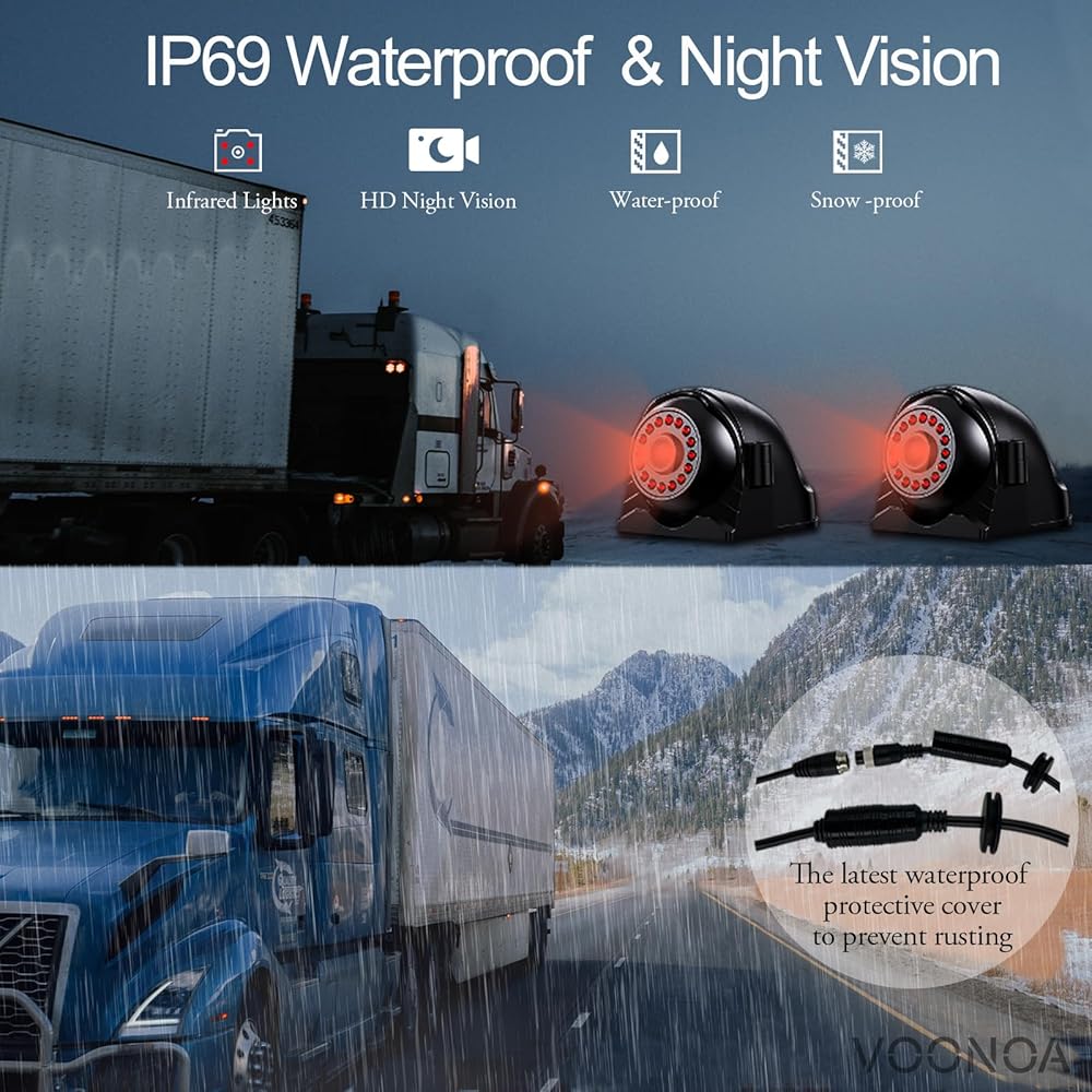 • 【IP69 مقاوم للماء 】 باستخدام تقنية إغلاق الغراء الكامل للكاميرات وإضافة أغطية مقاومة للماء لجميع الوصلات، يمكن لنظام شاحنة VOONOA العمل بشكل طبيعي في مختلف الظروف الجوية السيئة القاسية.