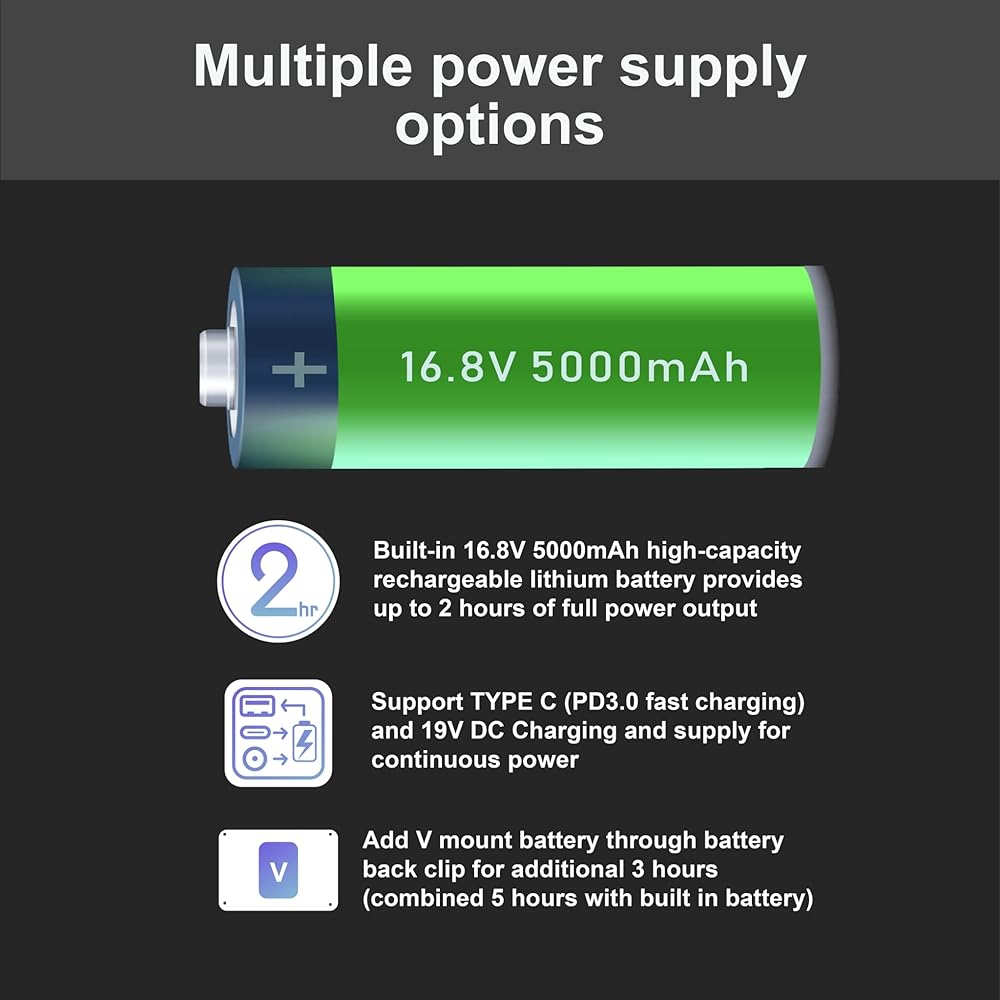 - بطارية مدمجة بقوة 84 وات في الساعة، و24 فولت تيار مستمر وشحن سريع PD3.0 بقدرة 35 وات. بطارية Vmount مدعومة.