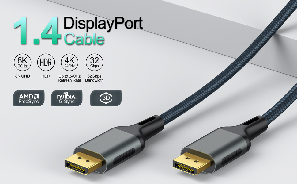 【8K DisplayPort 1.4 Cable】Display port Cable 1.4 supports high resolutions 8K(7680x4320)@60Hz, 5K(5120x2880)@60Hz, 4K(3840x2160)@60Hz/120Hz/144Hz, 2K@165Hz/144Hz, 1080P@240Hz. Supports Dynamic HDR and HDCP 2.2. Backwards compatible with DisplayPort 1.3, 1.2, 1.2a, 1.1 and 1.0.