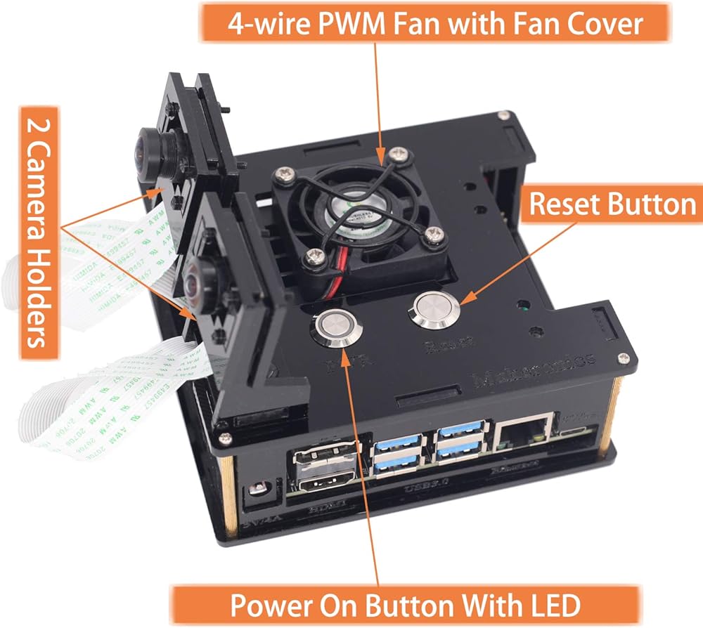 حافظة/غطاء أكريليك من Makeronics (أسود) لجهاز Jetson Nano B01 وA02 مع حقيبة الكاميرا | مفتاح التحكم في الطاقة وإعادة الضبط | مروحة تبريد | تتضمن تعليمات التجميع