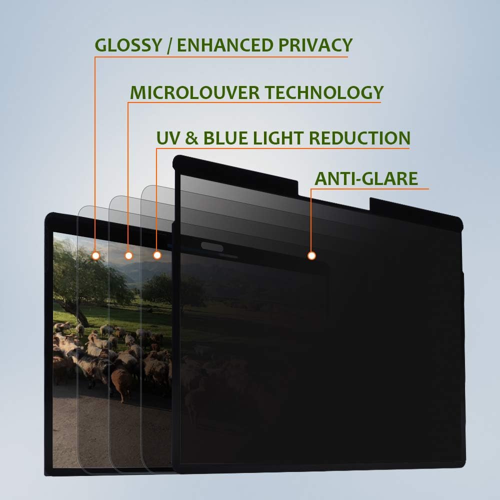 حماية الخصوصية الفائقة: أنت تلعب، نحن نحمي - فلتر الغشاء المتطور متعدد الطبقات يعمل على تعتيم شاشتك عند المشاهدة من الجانب، مع الحفاظ على شاشة واضحة مباشرة في الأمام. البيانات مرئية فقط أمام الشاشة، تظهر شاشة مظلمة أو تحجب الشاشة من الرؤية الجانبية. كما أنه يحمي عينيك من الوهج الضار والأشعة فوق البنفسجية والضوء الأزرق. كما أنه الحل الأمثل لأماكن المكاتب المفتوحة والجامعات والمؤسسات المالية ومقدمي الرعاية الصحية والسفر لدى الشركات.