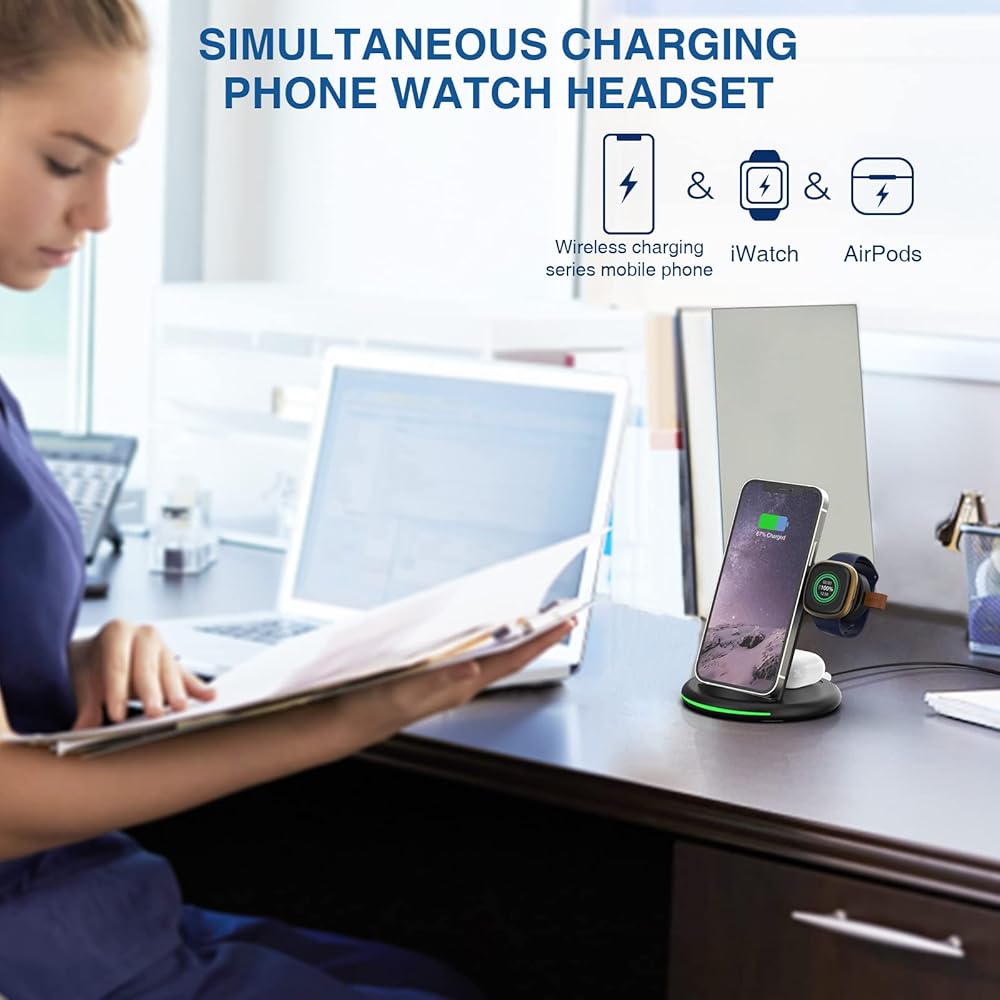 • 【 آمن ومستقر 】يحتوي الشاحن 3 في 1 على شريحة ذكية، ويحمي أجهزتك من الشحن الزائد والتيار الزائد والجهد الزائد، والتحكم في درجة الحرارة. يوفر الأداء الجيد لتبديد الحرارة بيئة شحن آمنة بشكل فعال. ملاحظة: يرجى إخراج الملحقات المغناطيسية أو المعدنية عند الشحن